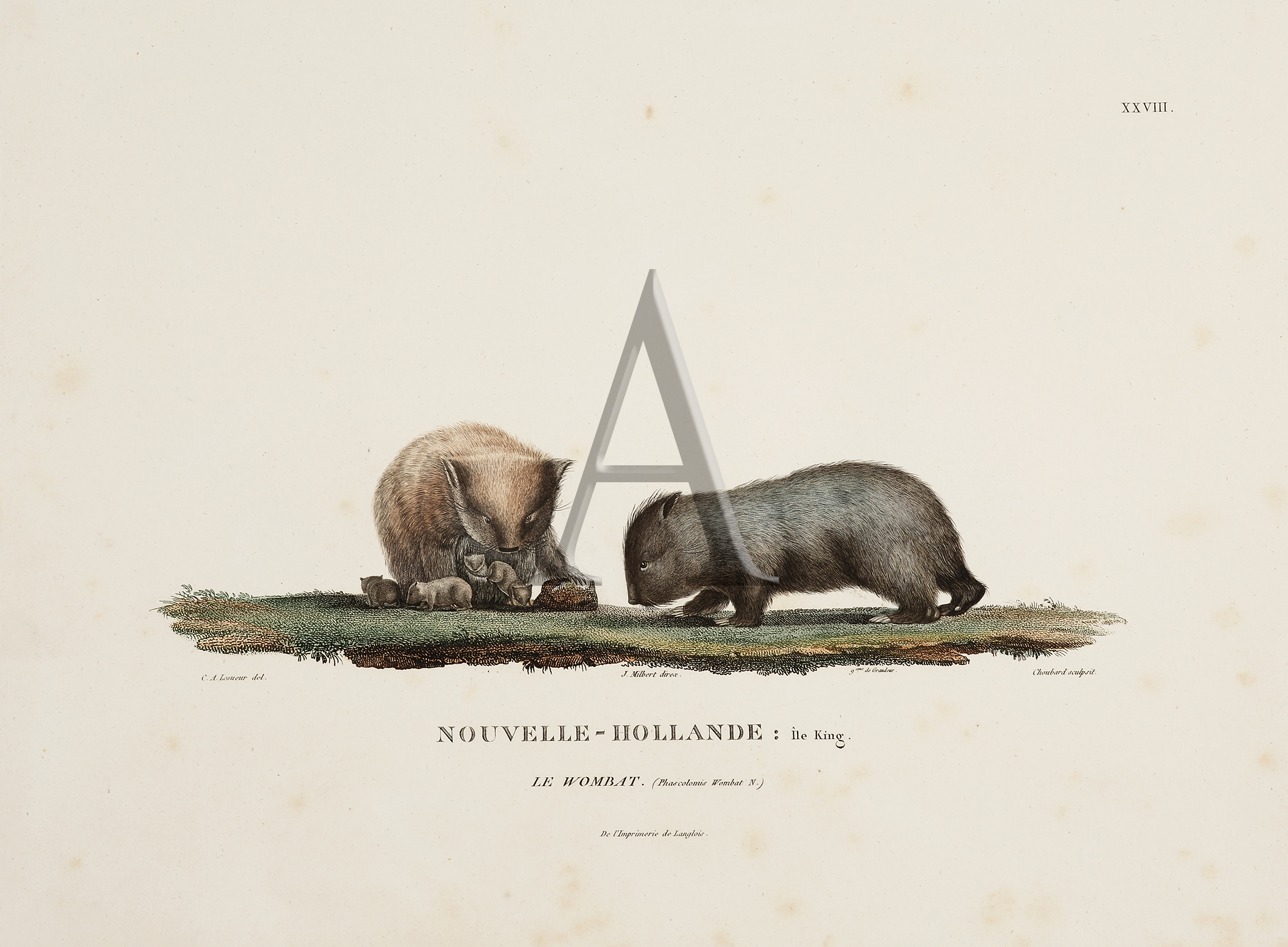 Rare c.19th hand coloured engraving of a Wombat by Charles Alexander Lesueur artist onboard the French voyage of exploration under the command of Nicholas Baudin in the corvettes; Geographe and Naturalist. The first reported sighting of a wombat was on … Read Full Description
