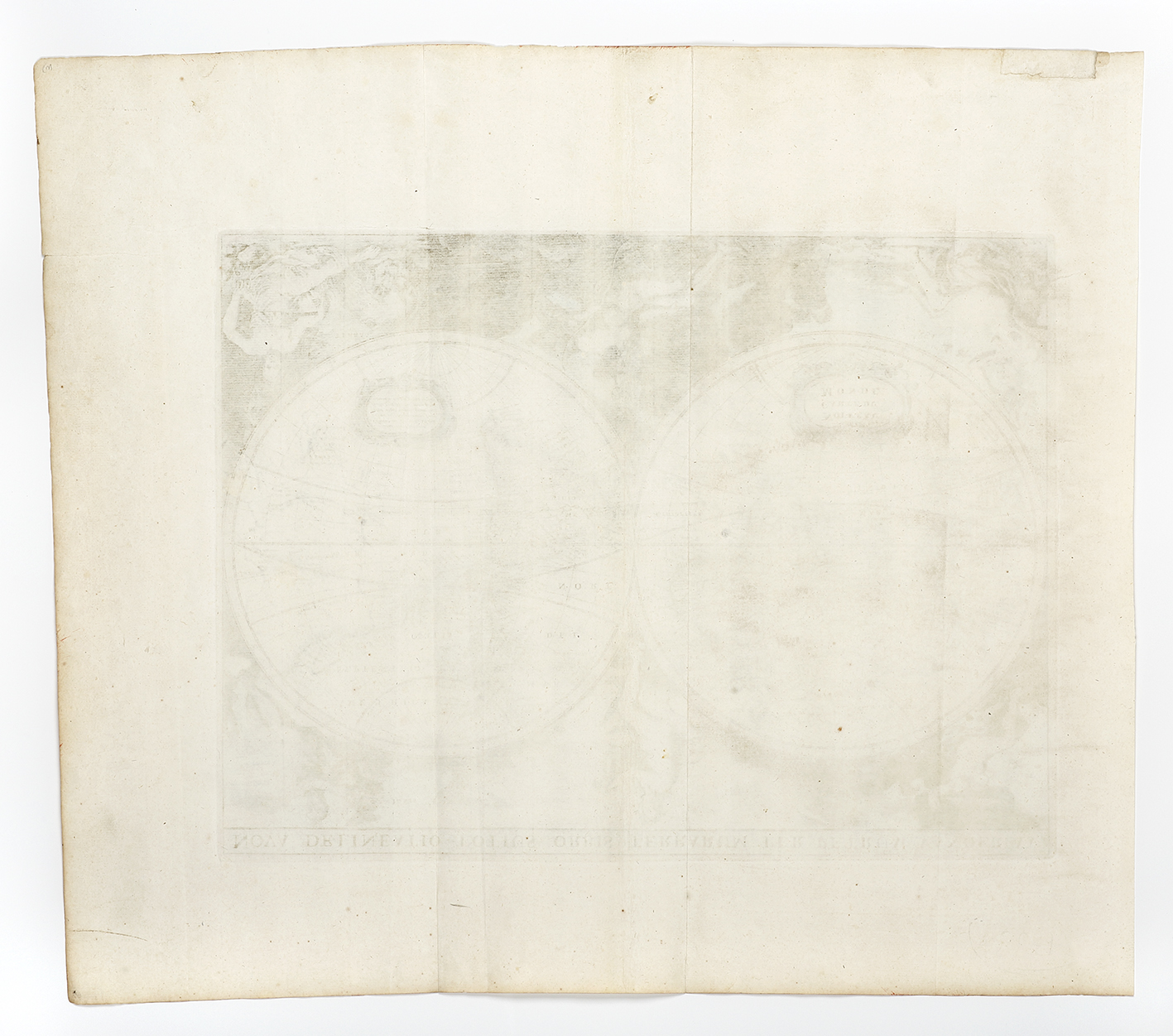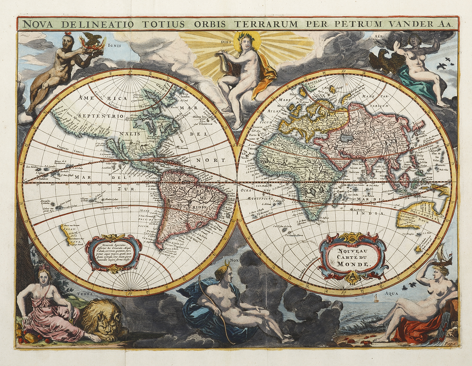 Superb, highly embellished double hemisphere world map, surrounded by six figures representing Day, Night, and the four elements, showing Australia and New Zealand with the discoveries made by Abel Tasman on his two voyages of discovery 1642-44. California is shown … Read Full Description