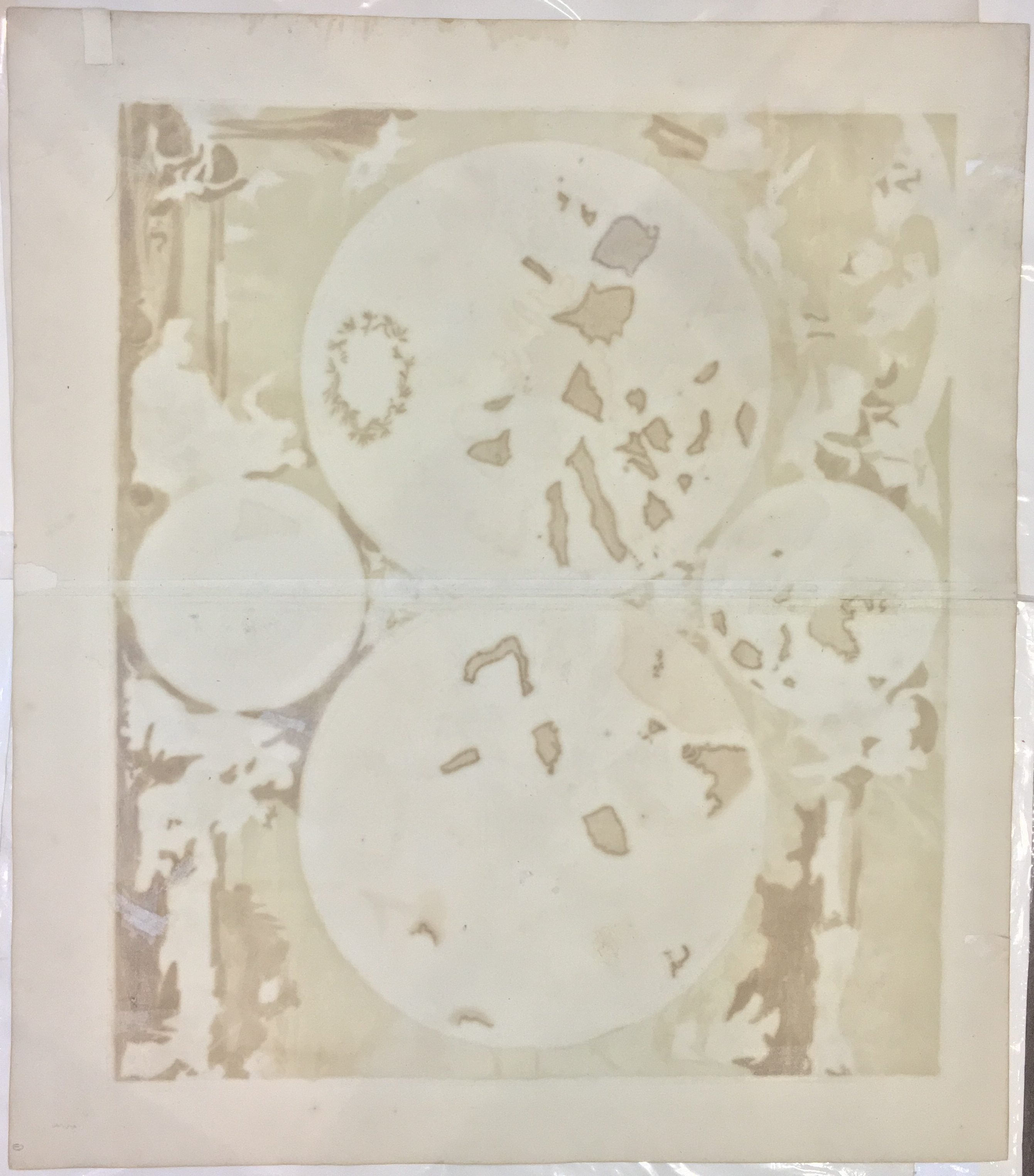 The four spheres surrounding the double hemispheres, were etched by Romeyn de Hooghe giving a sensitivity to the illustrations that would not have been possible with the usual engraved process. In each corner are large allegorical scenes representing the four elements: Fire is represented by war and the figure of the three-headed dog Cerberus, guardian of Hades, suggests the release of destructive forces into the world, Air by Gods in the heavens against the background of the revolving Zodiac, Earth by harvesting and husbandry, Water by ships on a calm sea and a spouting whale. There are groups of figures situated between the hemispheres and above and below the two smaller polar maps.