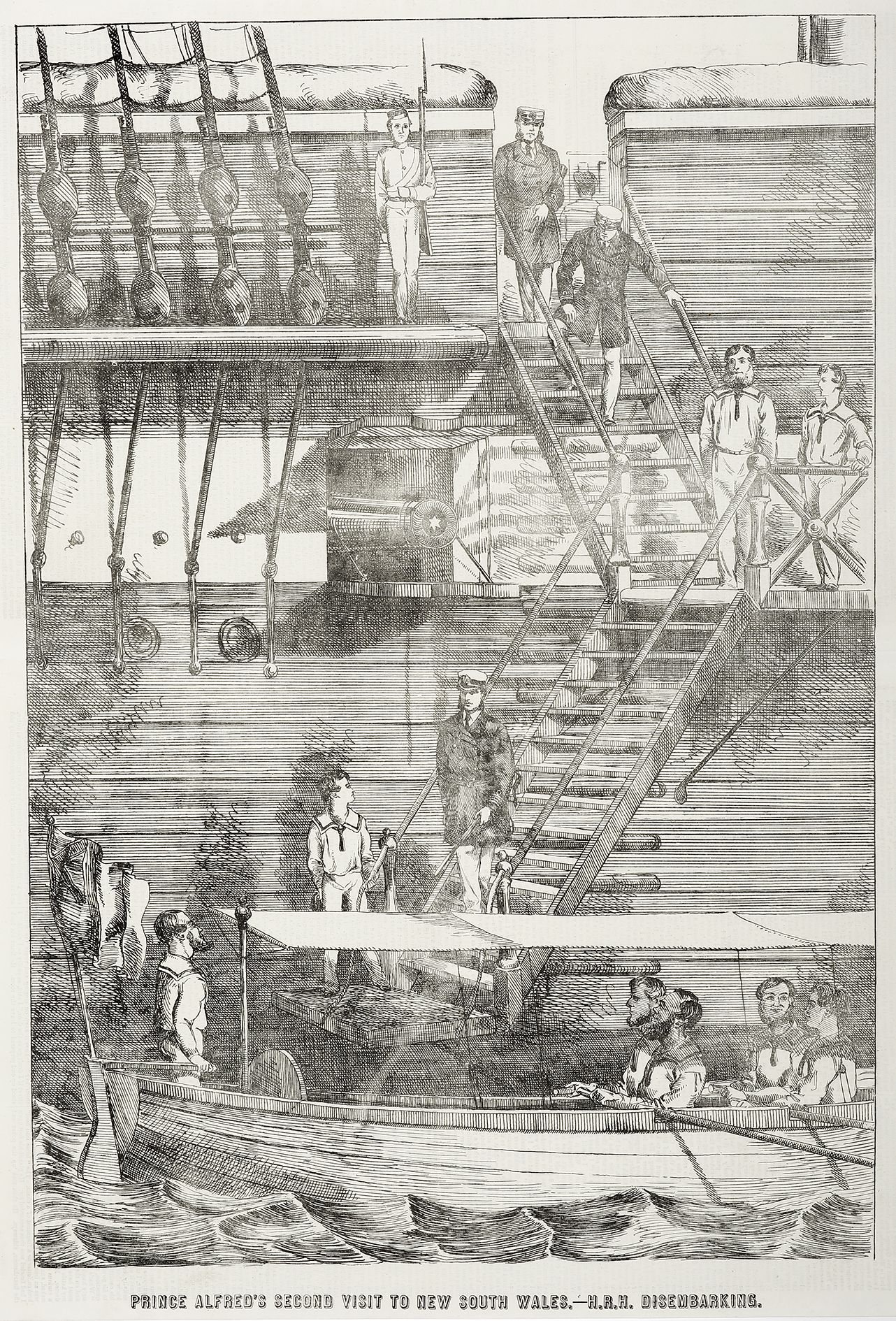 Very rare large engraving depicting the Prince Alfred returning to Sydney the year after the attempted assassination attempt on his life, during his visit in Sydney in 1868.