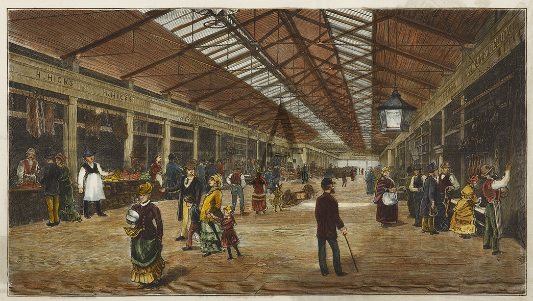 Colonial engraving of of the interior of the original markets opposite the Sydney Town Hall which made way for the Queen Victoria Building in 1898. Good detail. From original edition of, The Graphic.