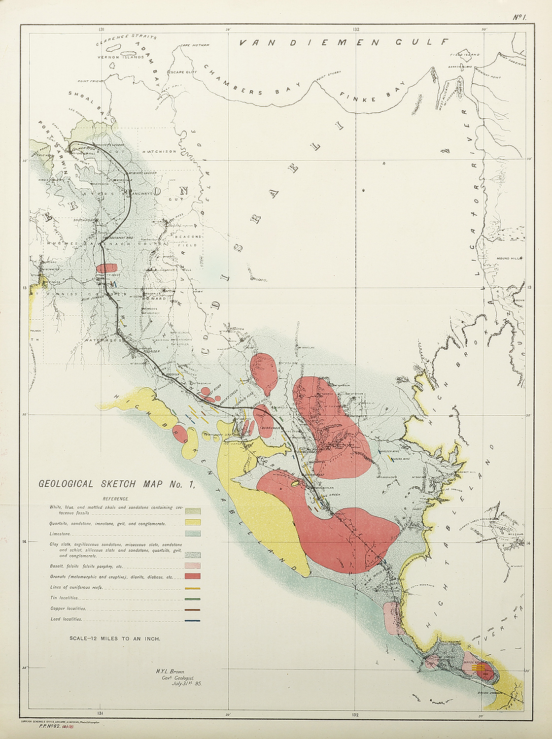 Scarce set of eight geological maps of the Northern Territory. Geological Sketch Map no. 1: size 396mm x 293mm Geological Sketch Map no. 2: size 278mm x 178mm Geological Sketch Map no. 3: size 297mm x 168mm Geological Sketch Map … Read Full Description