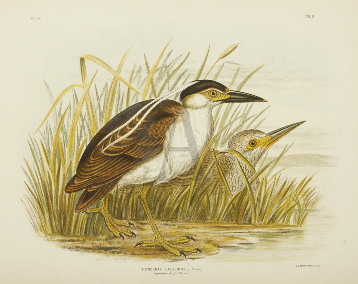 Nycticorax Caledonicus. Nankean Heron. - Antique Print from 1889
