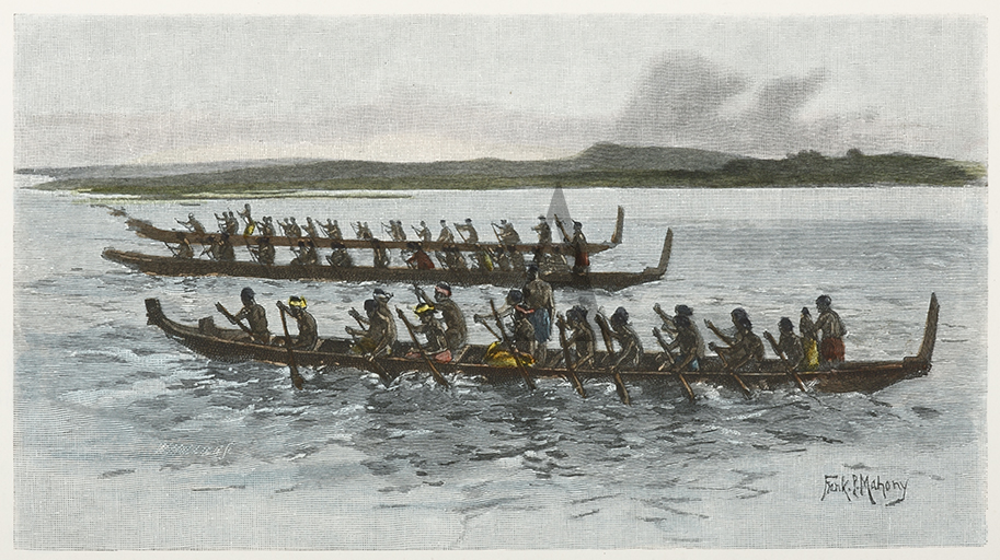 C.19th engraving of Maori canoe race by Frank Prout Mahony (1862-1916).