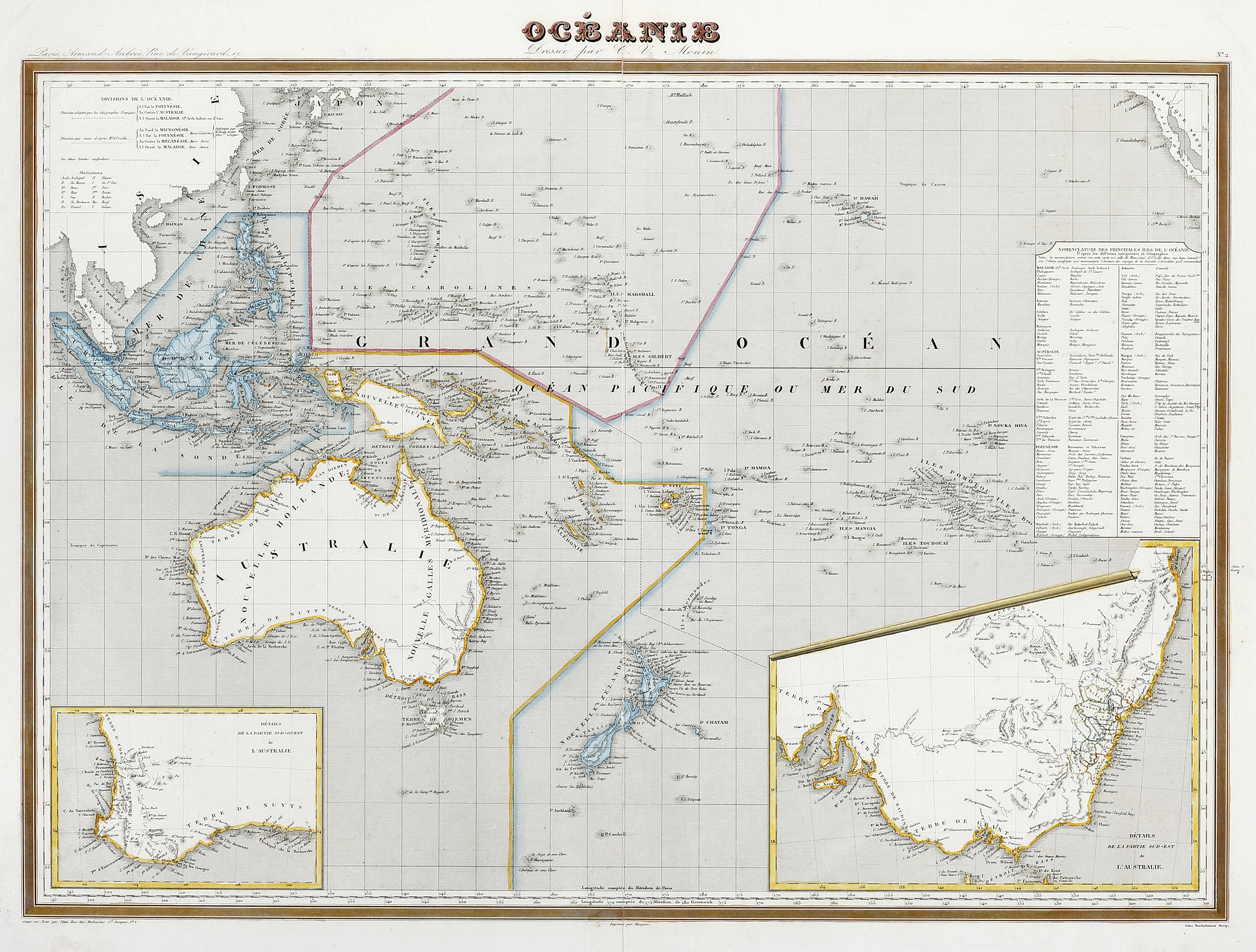 Detailed large scale c.19th French map of the Pacific with inset; Details de la Parties de Sud-est de L’Australie, at lower right, and Details de la Partie Sud-Ouest de L’Australie, at lower left. The map showing the southern coast prior to the founding of Adelaide (1836) and Melbourne (1835). There is a Nomeculture table at right.