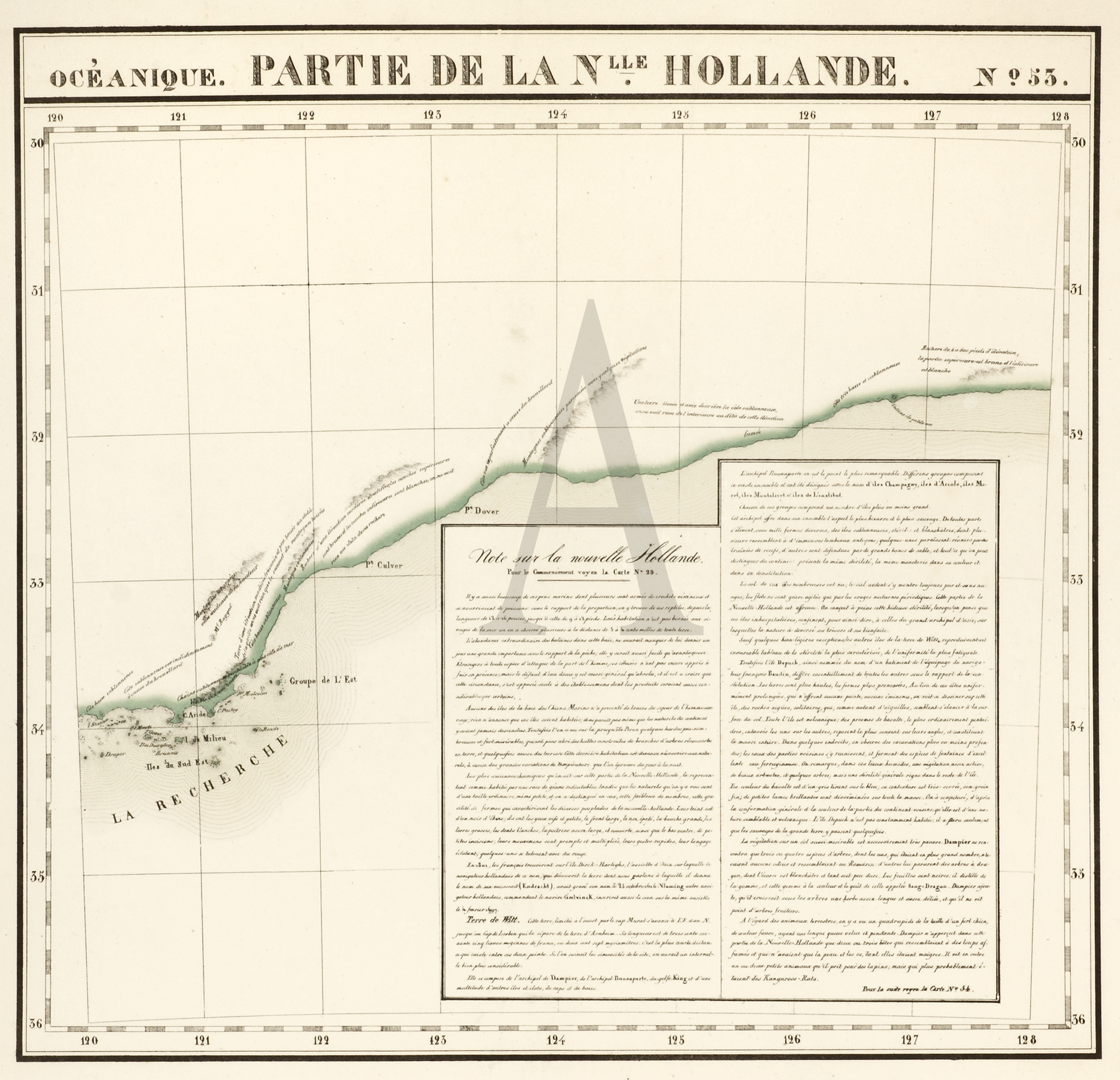 Scarce large scale c.19th hand coloured lithographic map of Western Australian’s southern coast from Vandermaelen’s monumental Atlas universel de geographie physique. This was the first atlas produced using lithography, the first in which all the maps were on the same … Read Full Description