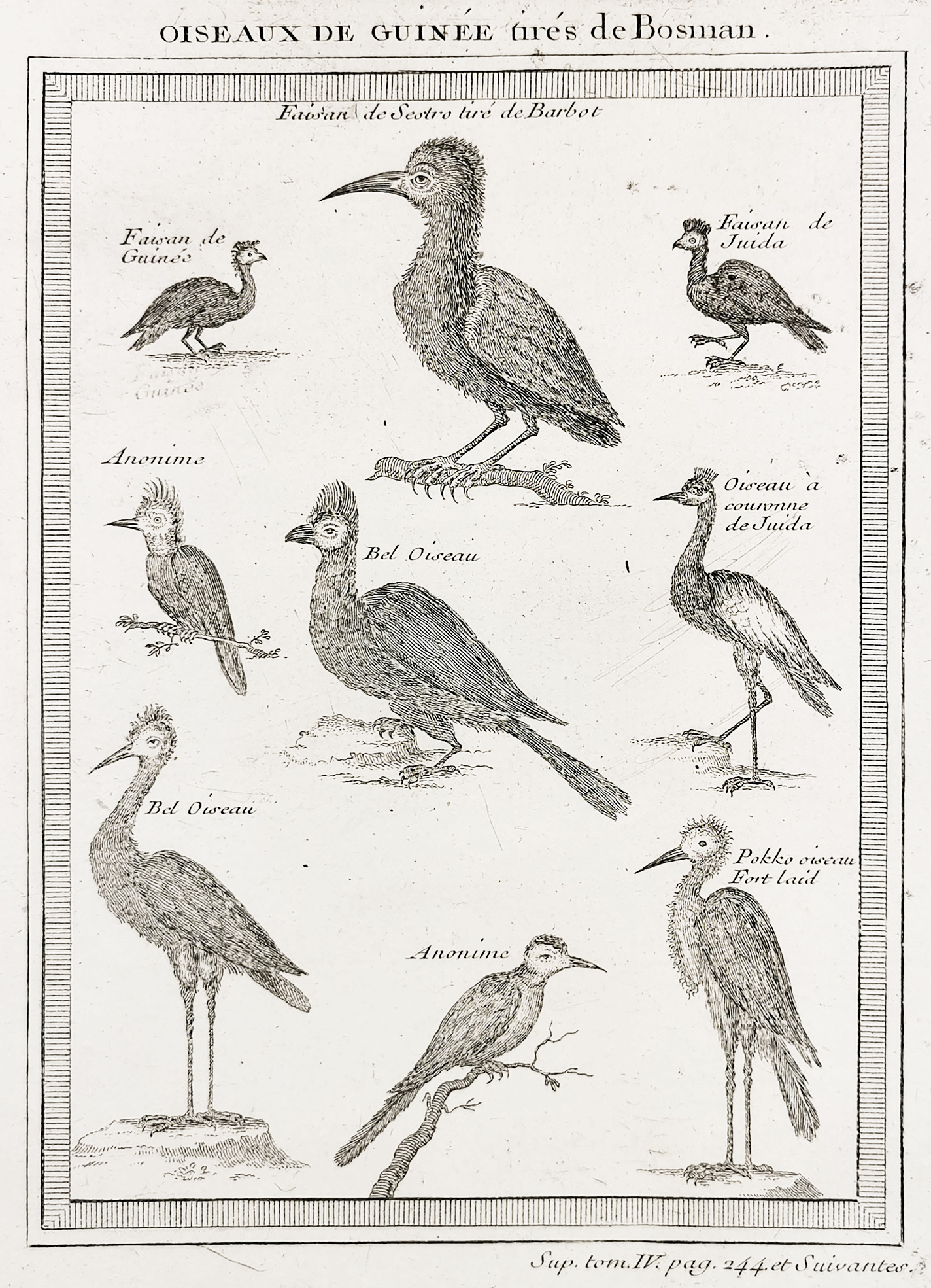C18th engraving of various birds found in Guinea, Africa From Prevost, Histoire generale des voyages.