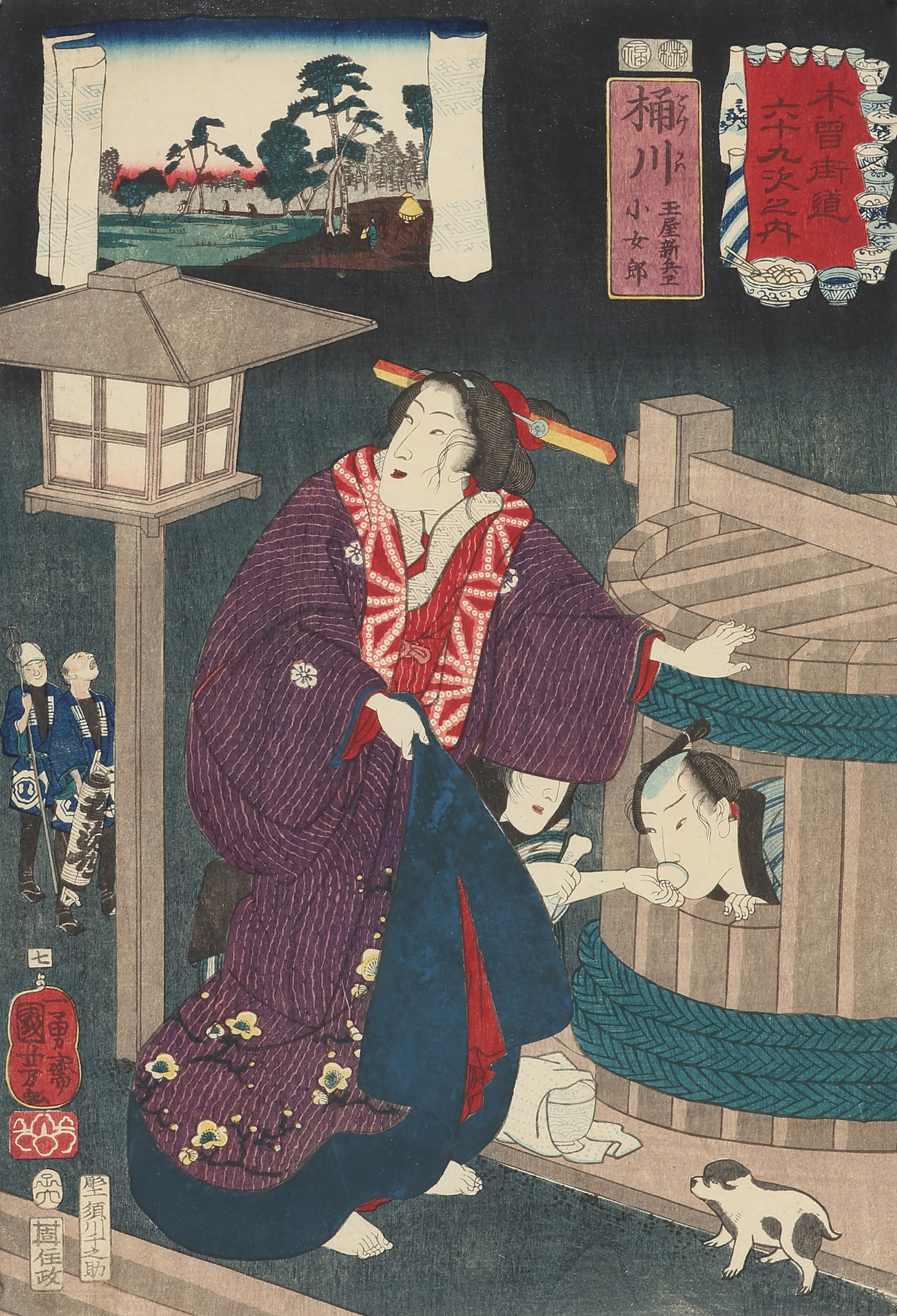 The courtesan Kojorô is shown keeping anxious watch, glancing towards the night patrol on the left, while her attendant serves sake to Tamaya Shinbei, her lover. Shinbei, punished for failing to pay his brothel fees, he’s confined within a barrel at the entrance to the pleasure quarter. Around the cartouche are vessels for food and sake, with a food container beside the barrel, and a small puppy playfully depicted at lower right.