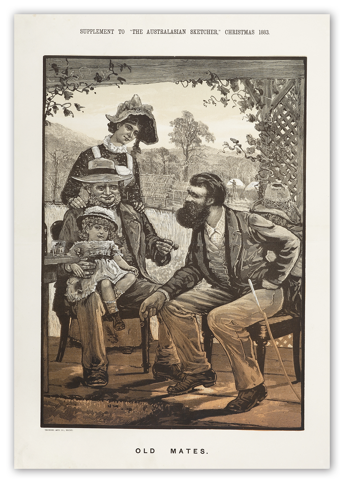 Rare supplement for The Australasian Sketcher 19th December 1883 of old mates catching up. From The Australasian Sketcher. Collections: State Library Victoria: Accession no: A/S19/12/83/supp