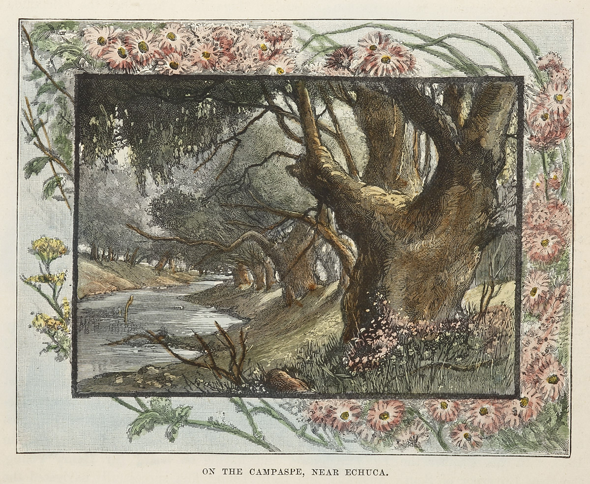 Lovely c.19th engraving of the Campaspe surrounded by Australian native flowers.
