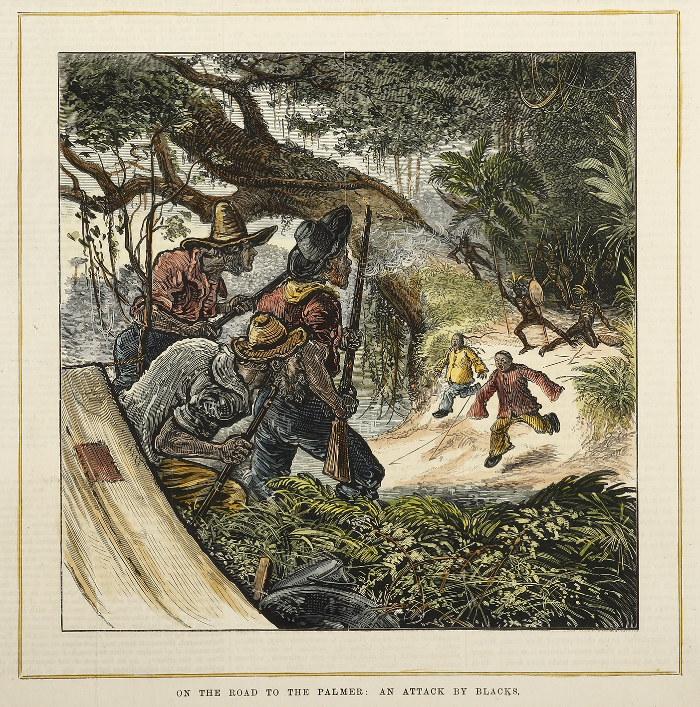 Scarce colonial engraving showing the Chinese miners being attacked by aborigines on the road to the Palmer River gold fields. Palmer River was one of Australia’s major gold rushes after William Hann and geologist Norman Taylor found gold in 1872. … Read Full Description