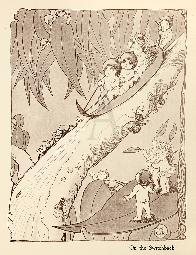 Cecilia May Gibbs, publishing under the name May Gibbs, was a childrens author and illustrator. She is best known for her gumnut babies (also known as &quotbush babies&quot or &quotbush fairies&quot), and Snugglepot and Cuddlepie. From a vintage edition of ‘Tales of Snugglepot &amp Cuddlepie’.