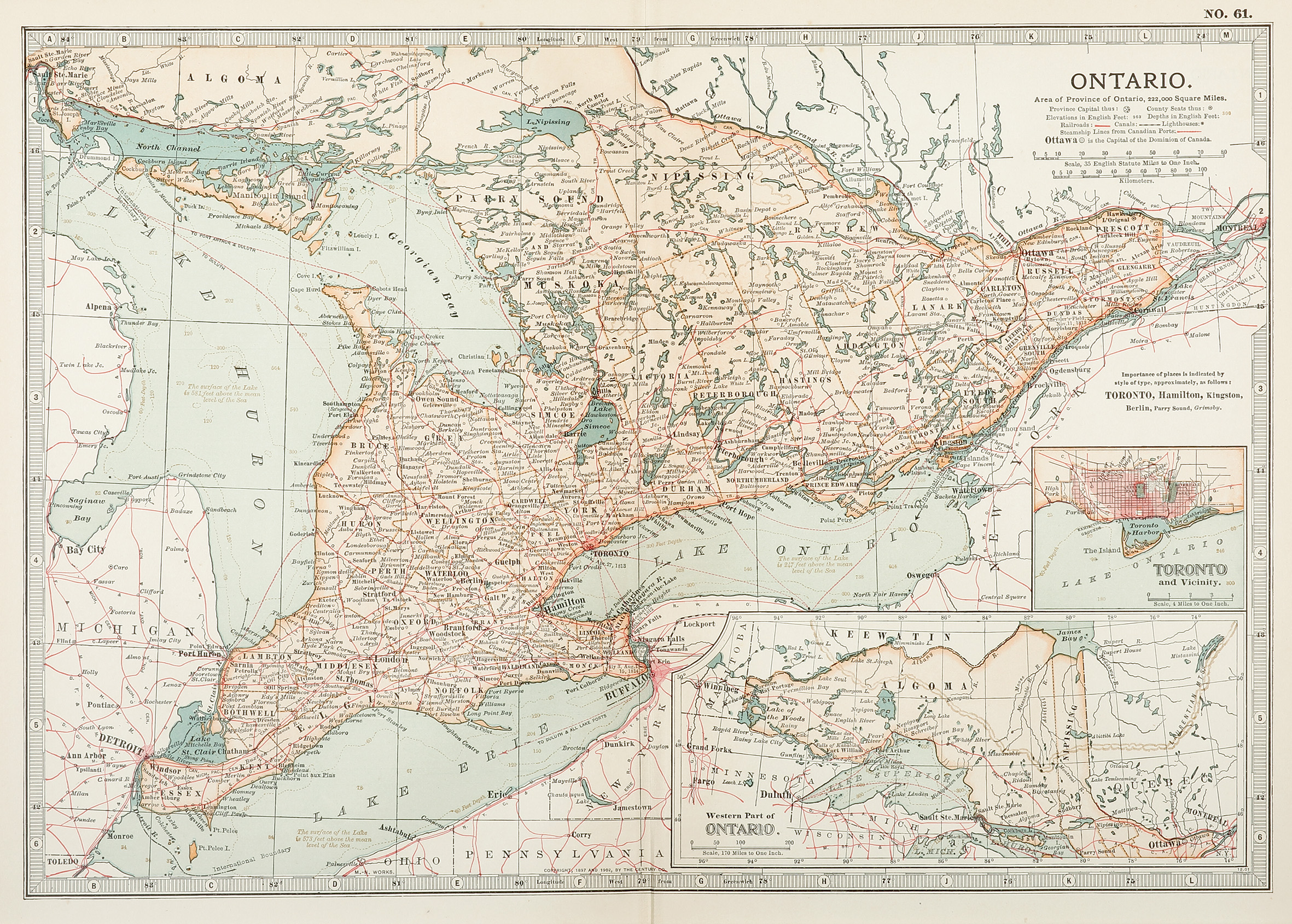 Detailed early c.20th map of Ontario with insets of Toronto and Western Part of Ontario. Collections: National Library Australia: Bib ID 2243430 State Library New South Wales: Record Identifier 74VMbm46b8Xg State Library Victoria: Library YA ; 032 EN1