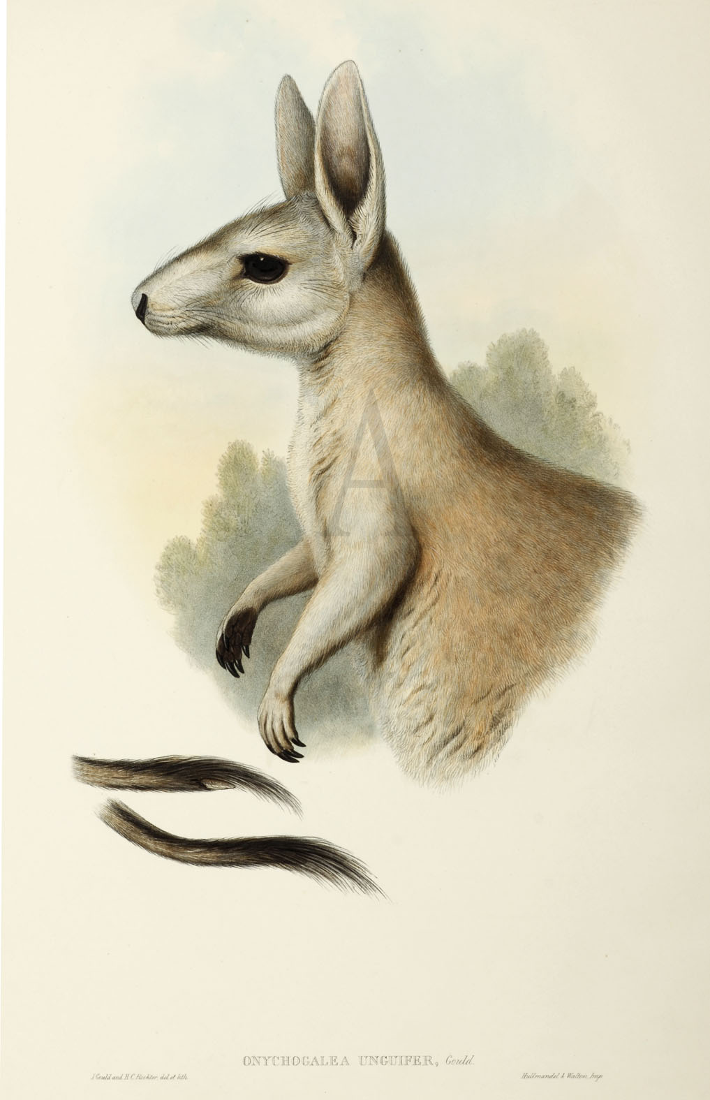 Rare c.19th lithograph of the he Northern or Sandy nail-tail Wallaby from John Gould’s epic work on Mammals of Australia published in London 1845-1863, the most important study on Australian Fauna.