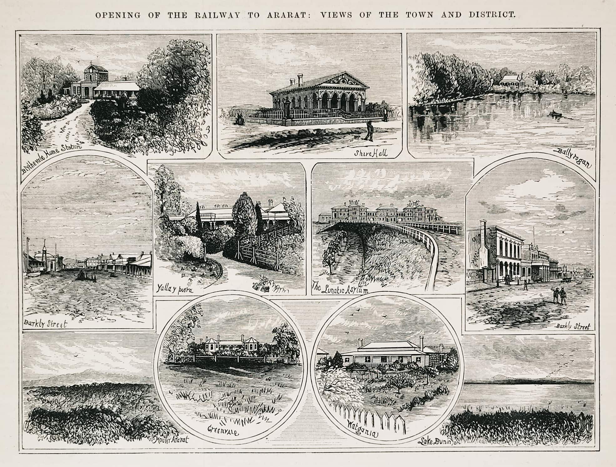 Rare colonial engraving of the Ararat with multiple views. Titles of inset views from top left clockwise; Blythevale home station, Shire Hall, Bally rogan, Barkly Streeet, Yalay poora, The Lunatic Asylum, Barkly Street, Mount Ararat, Greenvale, Watgania, Lake Buninjon. From the original edition of the Australasian Sketcher.