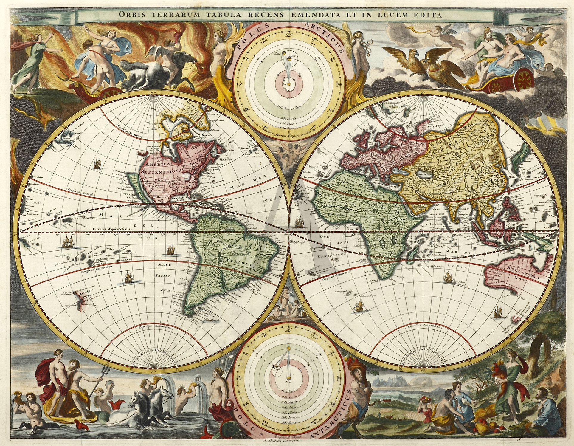 Superbly decorated c.17th double hemisphere world map based on the Visscher-Berchem map of 1658.