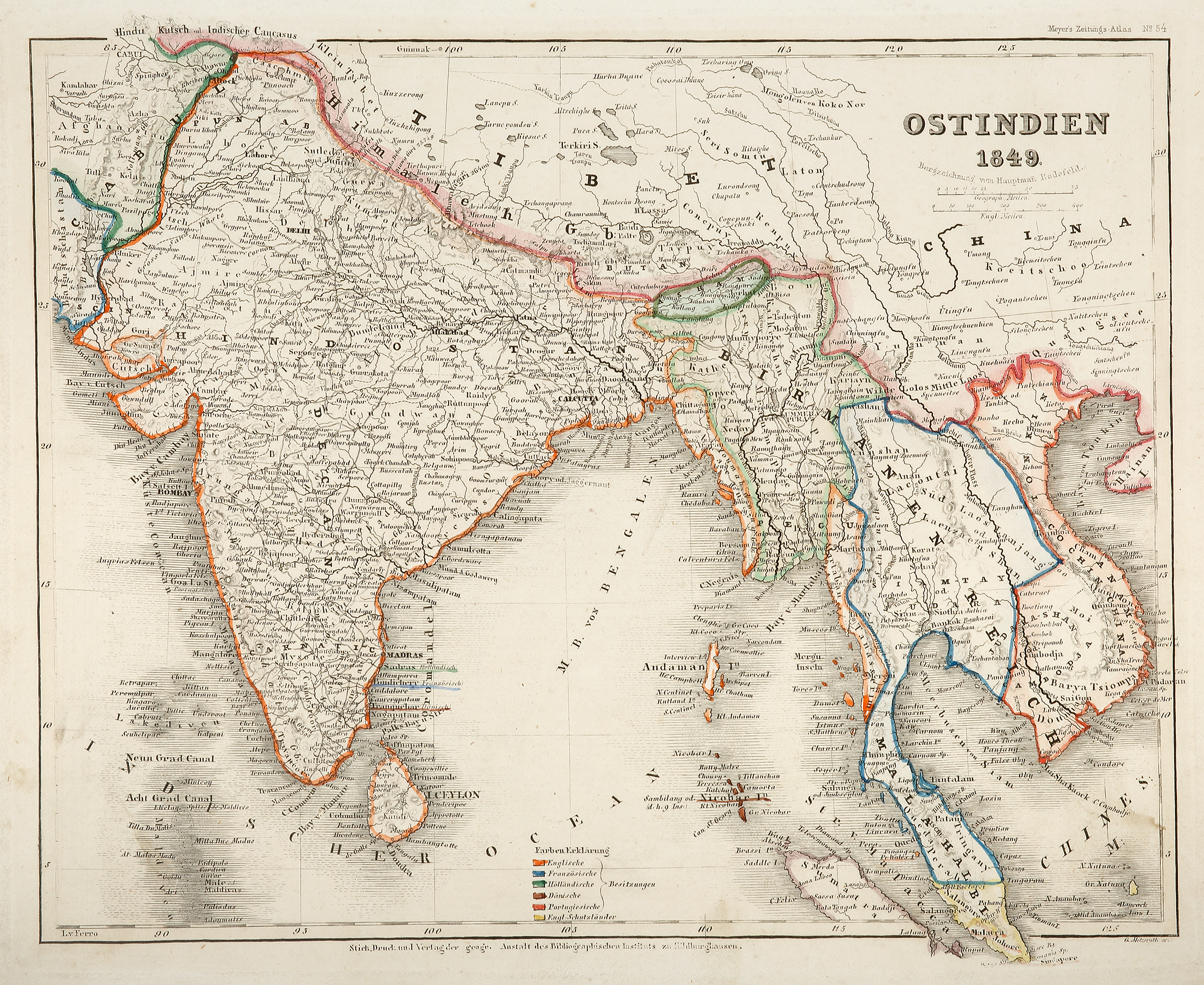 C19th map of Asia extending from India to Malay Peninsula. From Meyer’s Zeitungs und Groschen Atlas