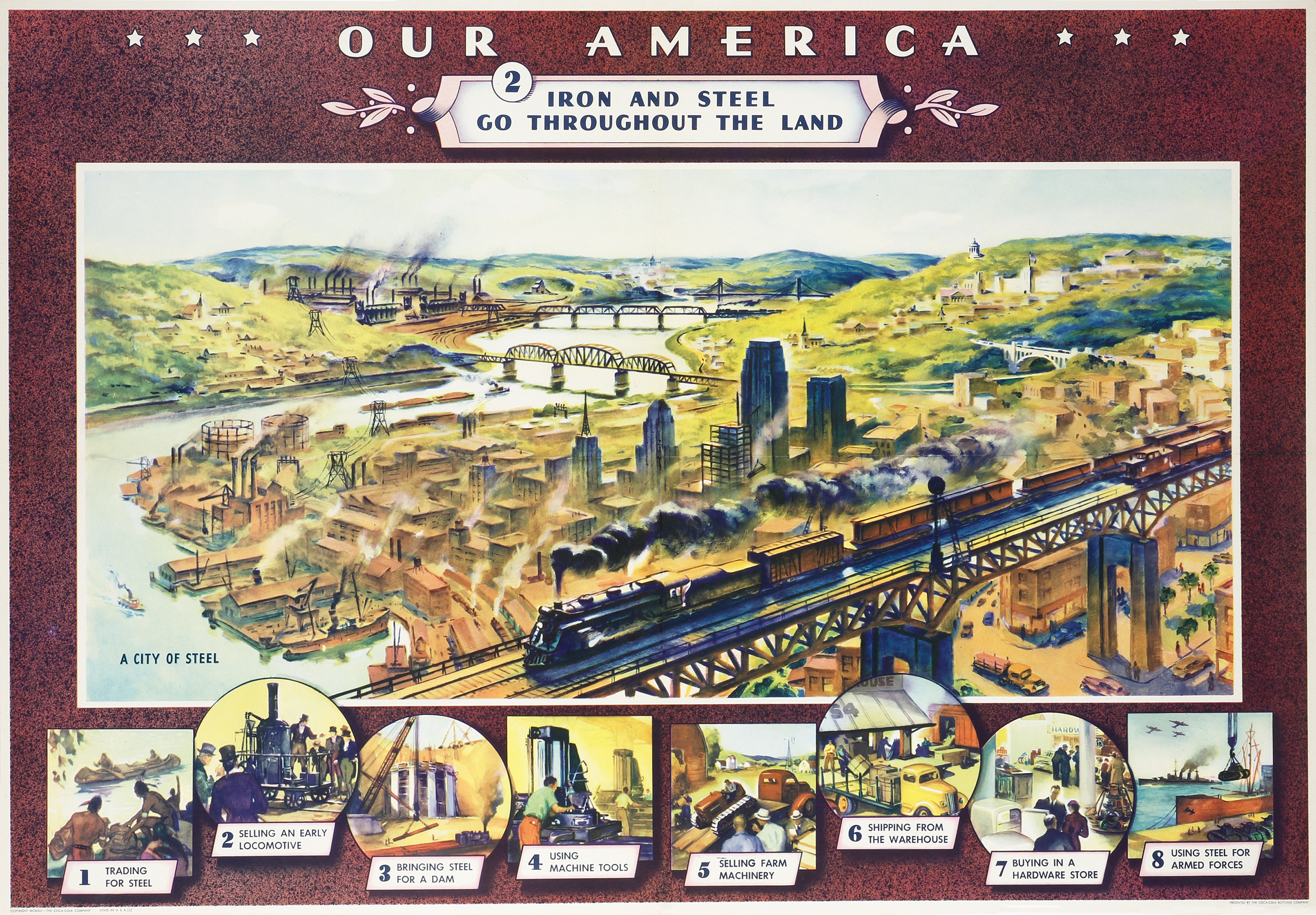 Great vintage poster commissioned by Cocoa Cola on the steel industry.