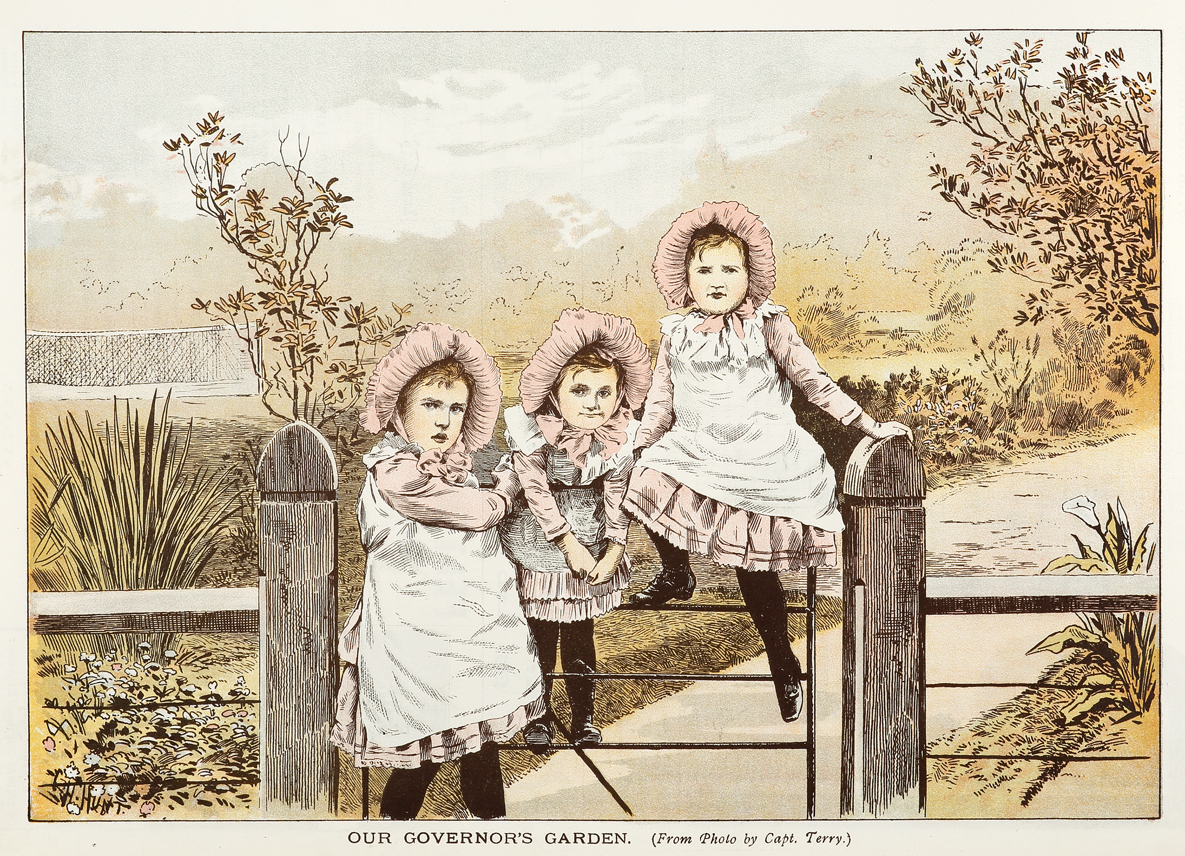 Colonial engraving of a three young girls in the Governor’s Garden, Sydney. From the original edition of the Illustrated Sydney News.