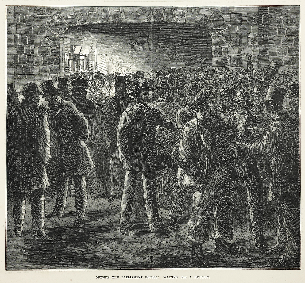Scarce c.19th engraving of a crowd waiting for a division outside the House of Parliament, Melbourne .