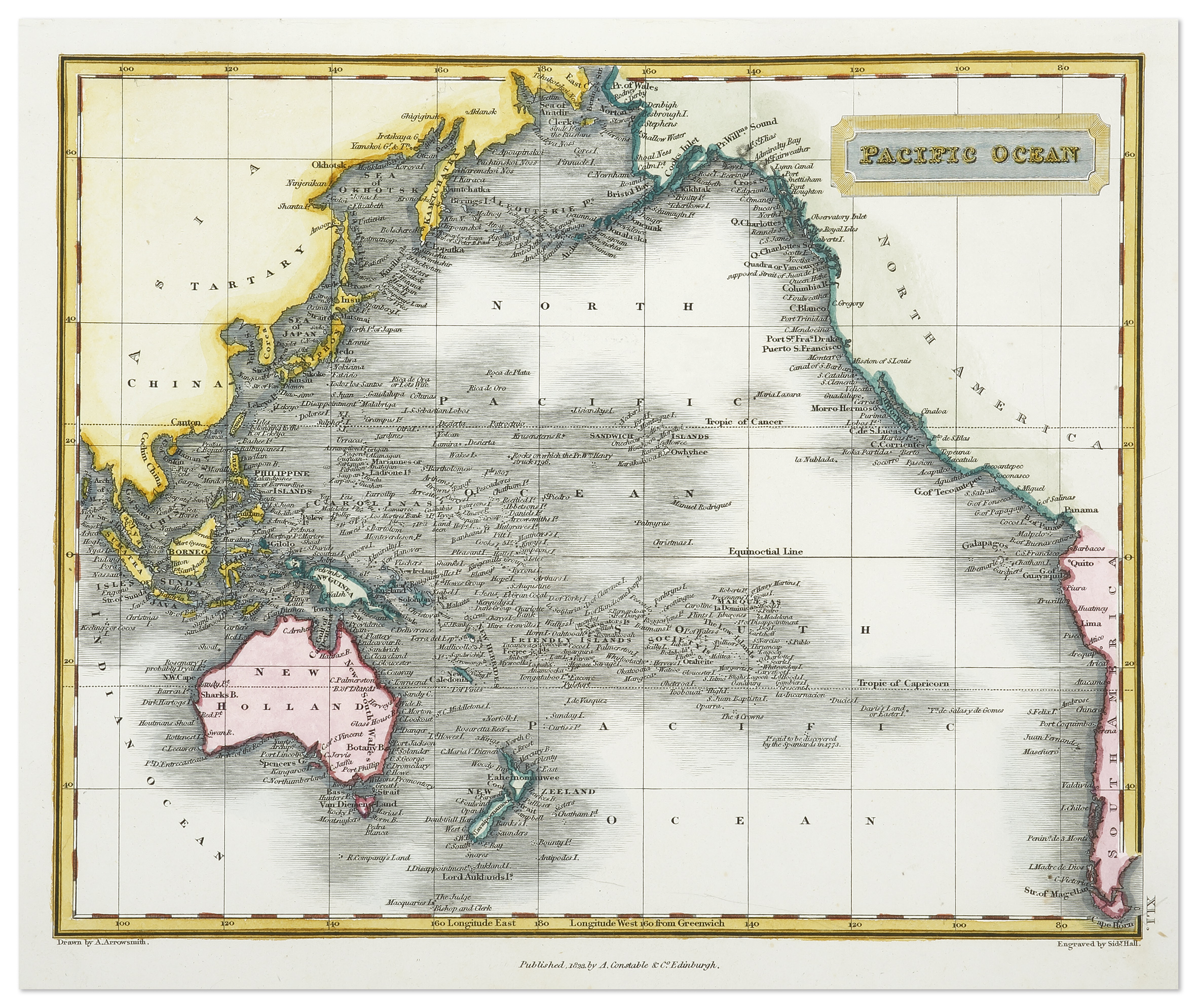 "Easily the foremost cartographer of his time" (Tooley) The Arrowsmiths were the leading British map publishers in the early 19th century founded by Aaron Arrowsmith. Born in an impoverished family, at Winston, Durham, 14 July 1750. He came to London about 1770 and although self taught he established himself as a land surveyor and worked for other publishers such as Faden and Cary. In 1790 he set up in his own establishment in Castle Street, Long Acre as a publisher and engraver. His first production was A Chart of the World on Mercator's Projection, Showing all the New Discoveries. This was published on 1 April 1790, and fore-shadowed the direction of his contribution to geography. He was to concentrate his considerable energies on the production of large scale general charts, recording of the latest geographical discoveries. His maps were sold singularly in sheets or collections but not in published atlas format and were constantly revised. He was Hydrographer to the Prince of Wales from about 1810 and subsequently Hydrographer to George IV. He used the material of important contemporary explorers such as Bass, Flinders and Colnett and had the confidence of travellers who sent him their manuscripts or information for inclusion in his maps. He received assistance from Dalrymple, Rennell, the Hudson Bay Company, the Ordance Office and the East India Company.