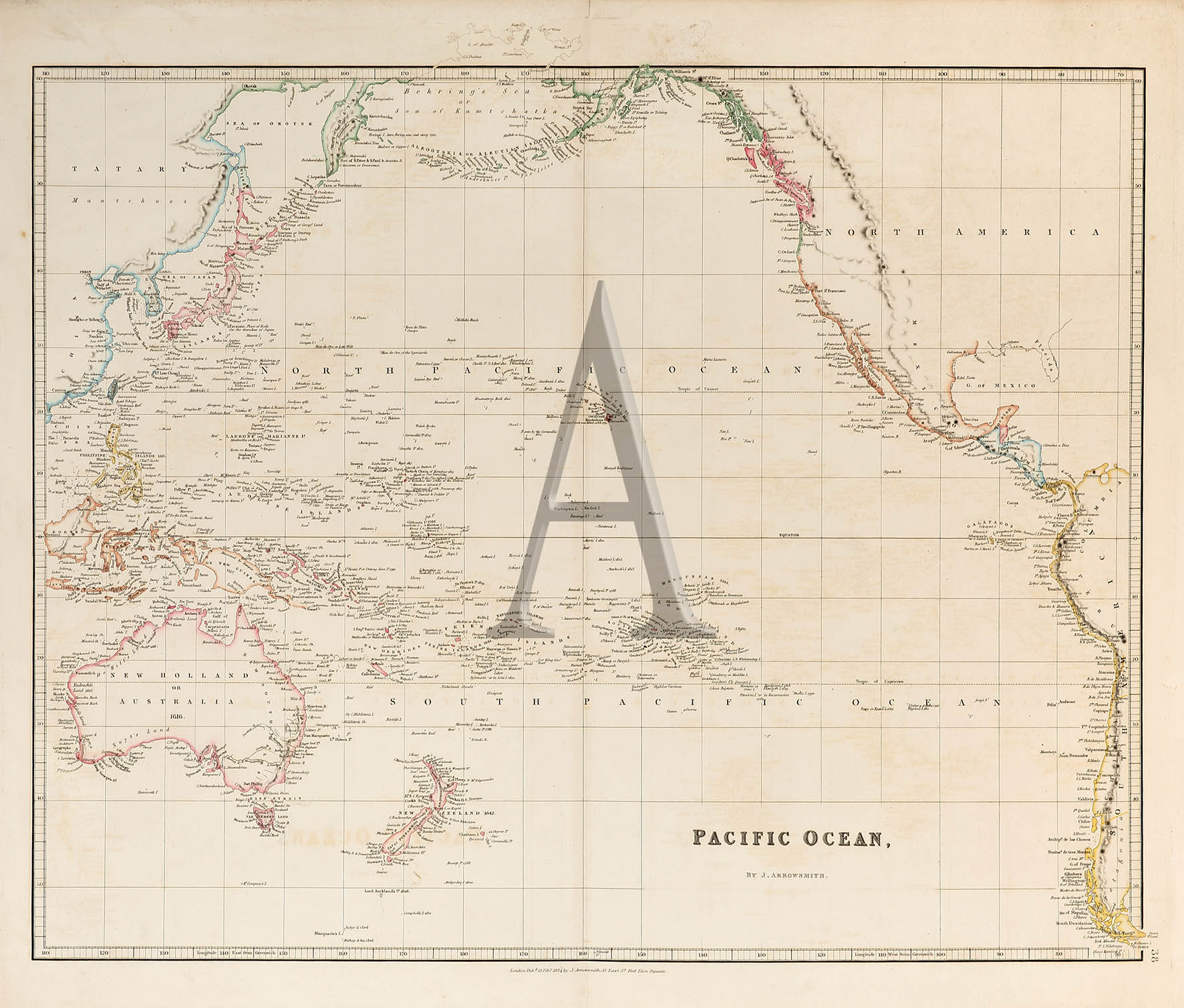 Early edition dated 15th Feb. 1834, published 1835, of Arrowsmith’s map of the Pacific, extending from Borneo, to the west coast of South America and north to the Behring Sea.