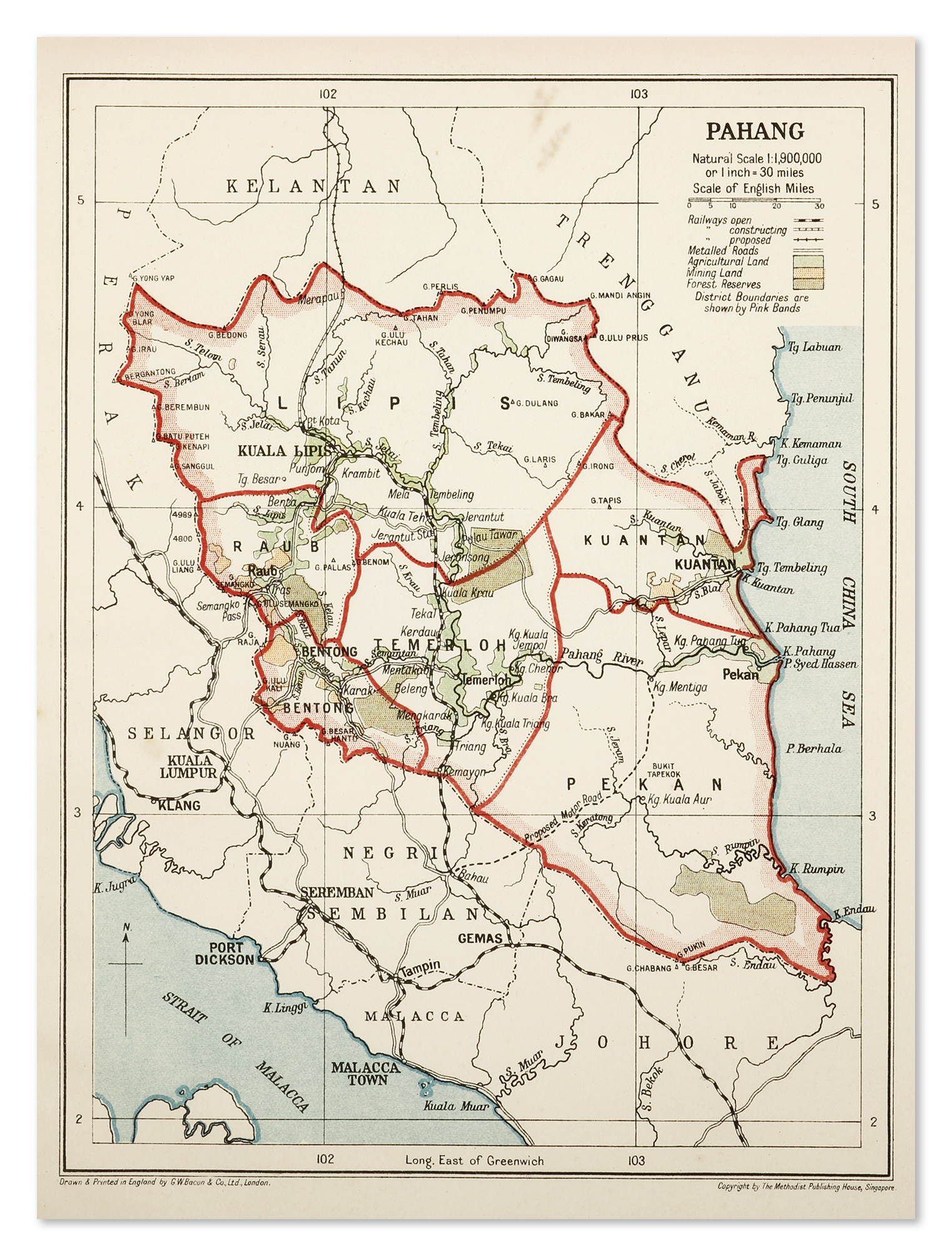 Rare map showing state boundaries of Pahang, Malaysia.