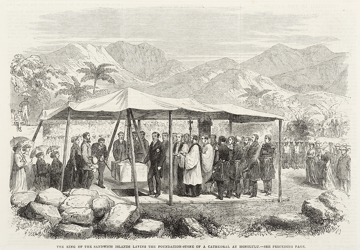 c.19th scene of the King of the Sandwich Islands laying the foundation-stone of a Cathedral at Honolulu.