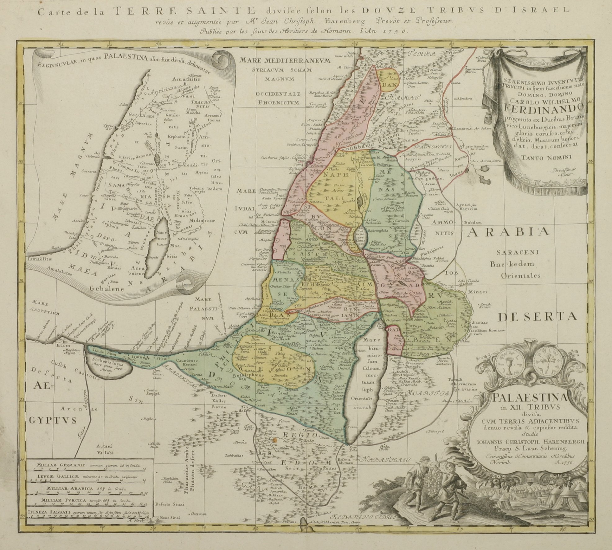 Depicts the twelve tribes with an inset of Palestine and deorative title cartouche.