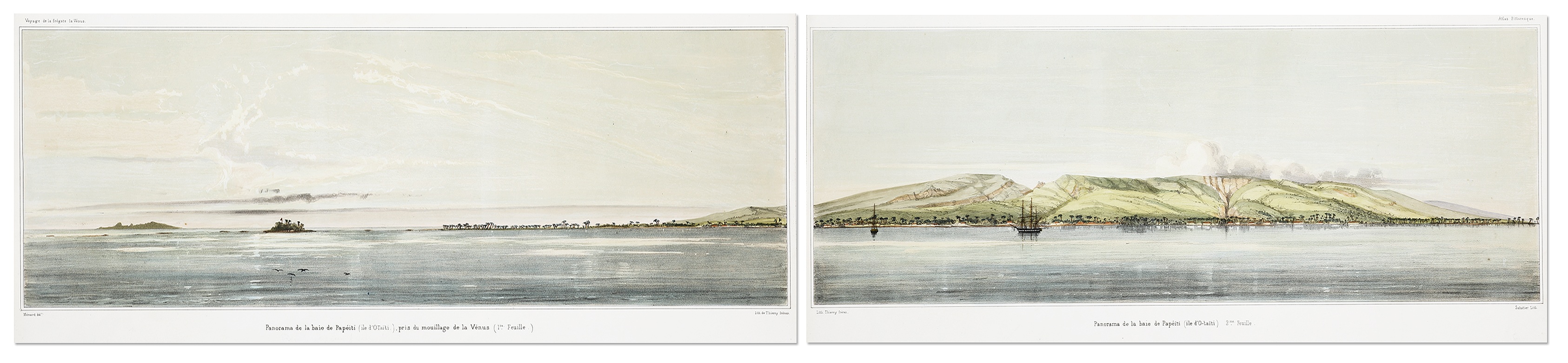 Rare c.19th two sheet panorama of Papeete, the capital of French Polynesia from the accounts of the Pacific voyage under the command of Abel Aubert Dupetit-Thouars.