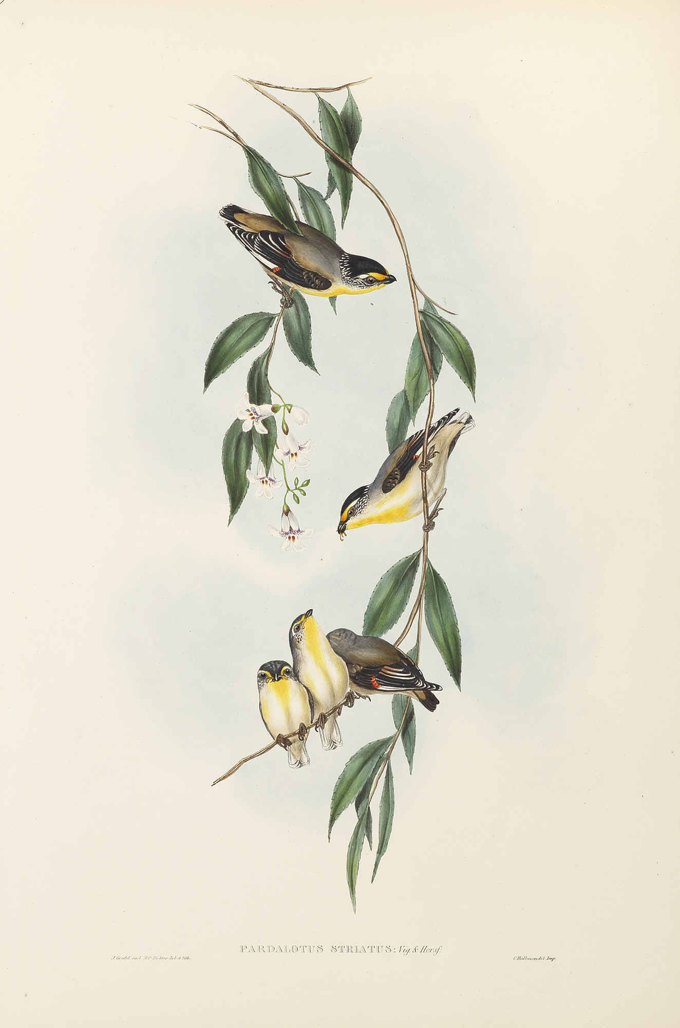 Rare lithograph of the best and largest colonial image of the Striated Pardalote by John Gould from his epic series, The Birds of Australia and Adjacent Islands, published for the author, printed by Richard and John E. Taylor, London.