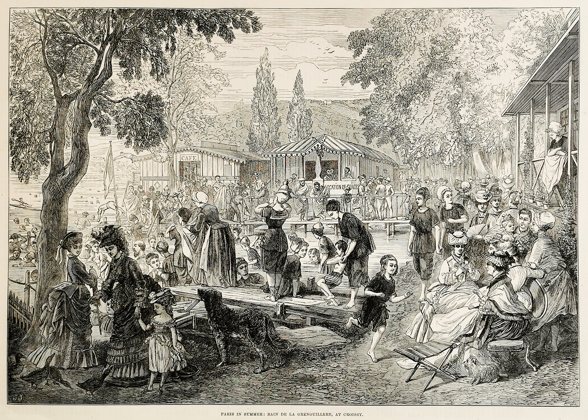 Engraving of a crowded swimming pavillion in summer.