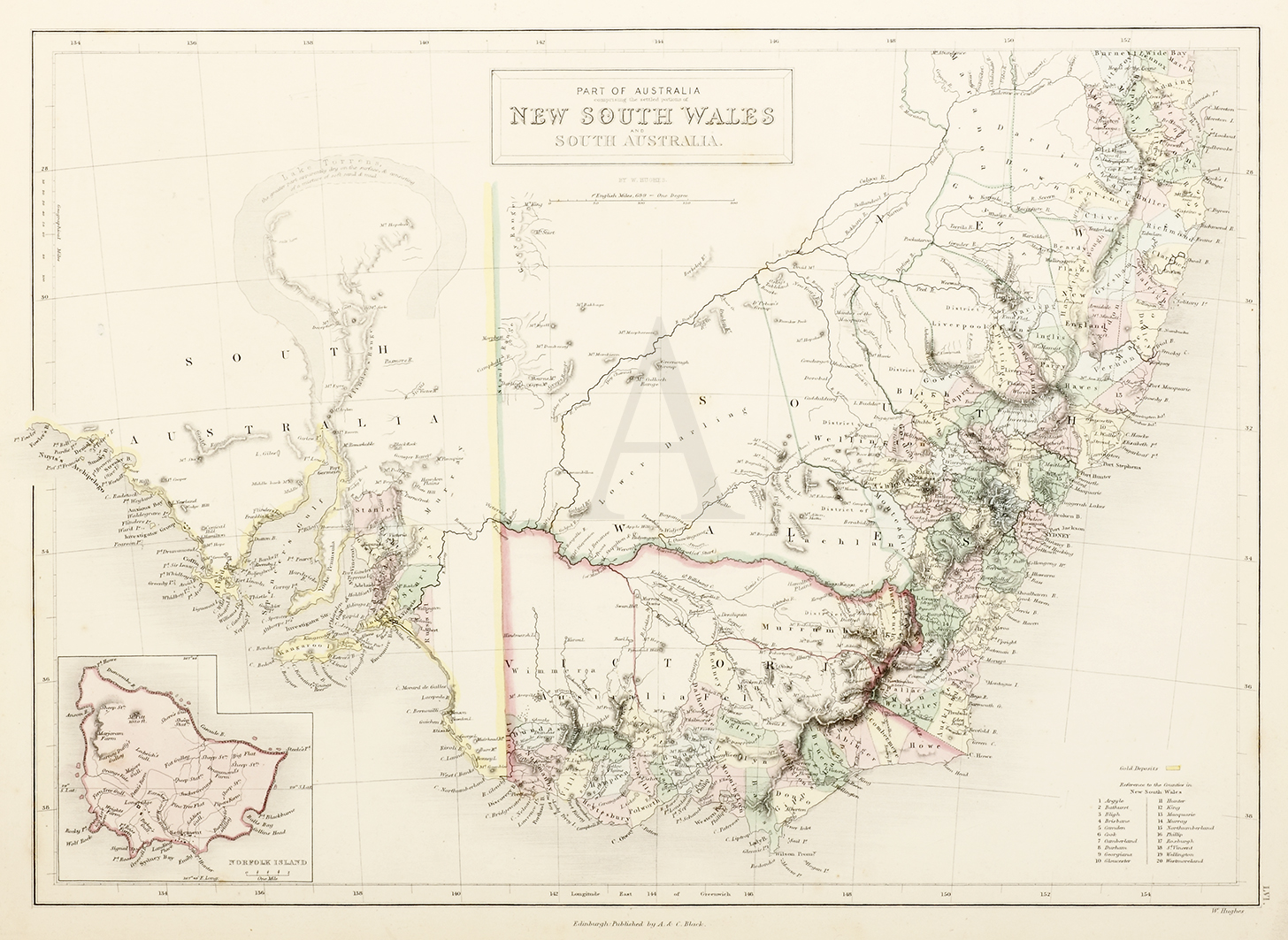 Superb example of this well known c.19th map, with a horseshoe shaped Lake Eyre, with a note stating, “the greater part apparently dry on the surface, & consisting of a mixture of soft sand”. Inset of Norfolk Island and list of counties in New South Wales.