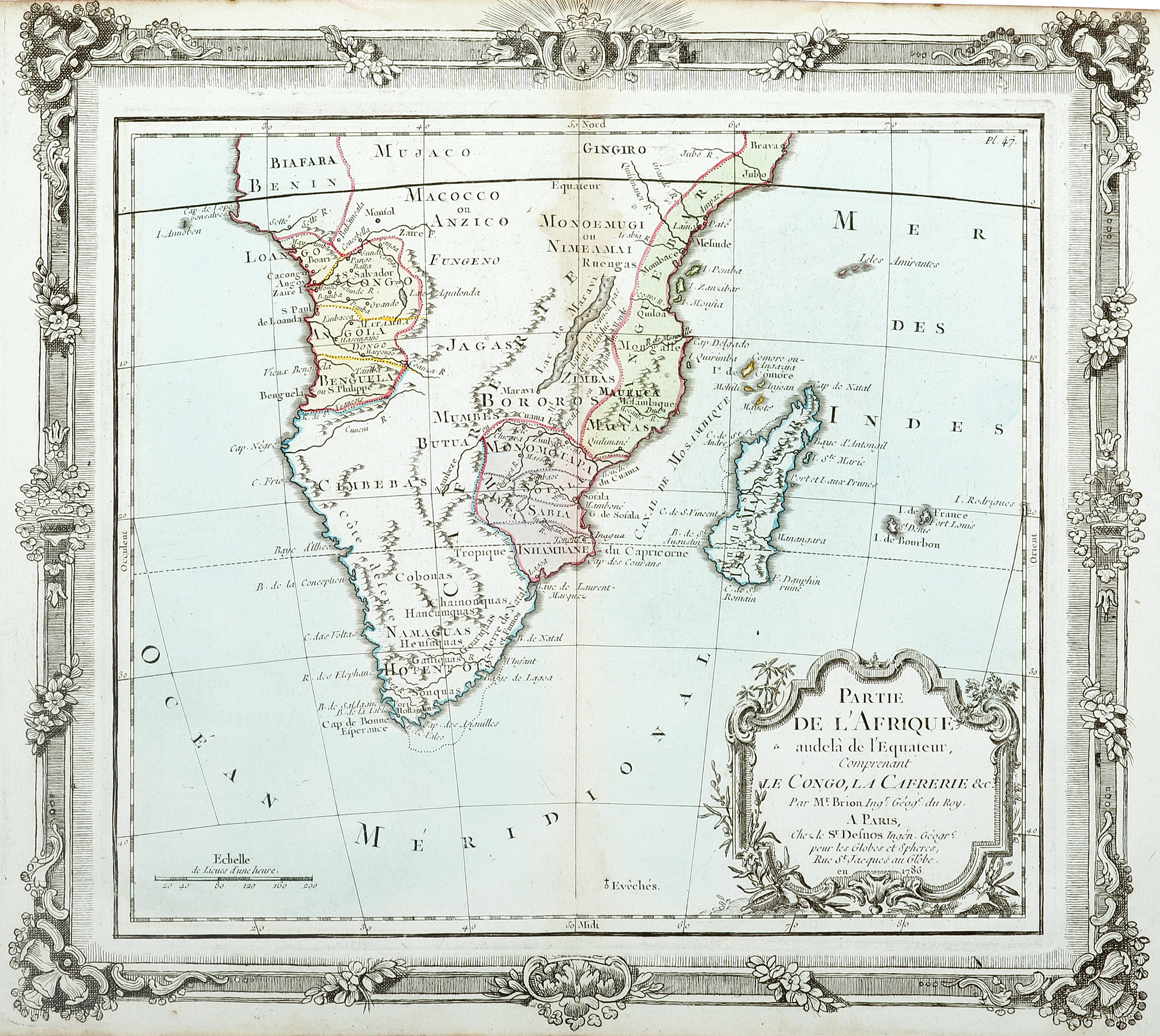 Beautiful c.18th map of south of Africa with an elaborate title cartouche and ornate frame border design by Charles Louis Desnos (1725-1805). From: Brion De La Tour, Atlas General, Civil, Ecclesiatique et Militaire…., Paris.