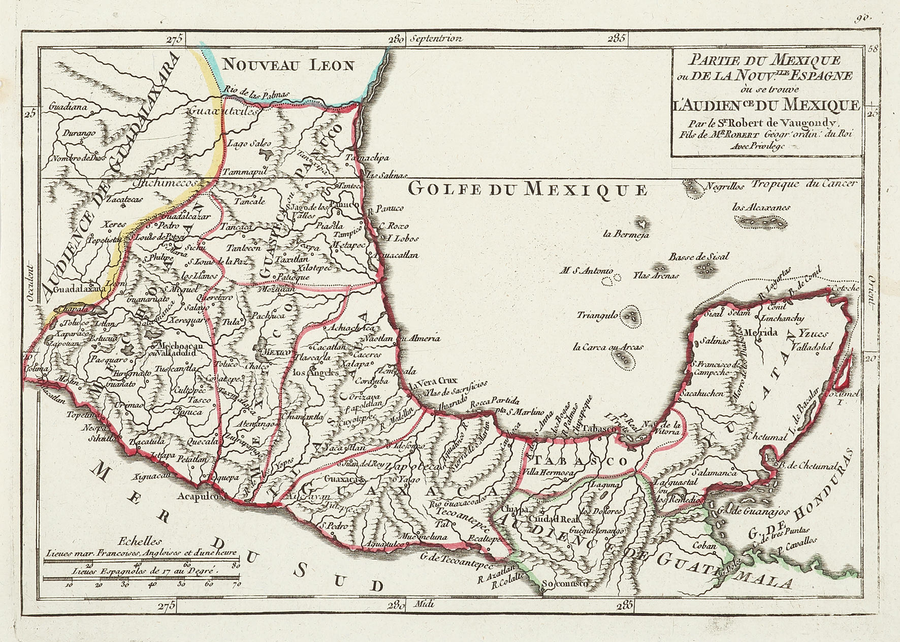 Scarce c.18th French hand coloured engraved map of the southern part of Mexico from Guadalajara to the Yucatán Peninsula by Robert de Vaugondy (1688-1766). From: RoBert de Vaugondy, Atlas portatif, universel. Composé d’après les meilleures cartes, tant gravées que manuscrites, … Read Full Description