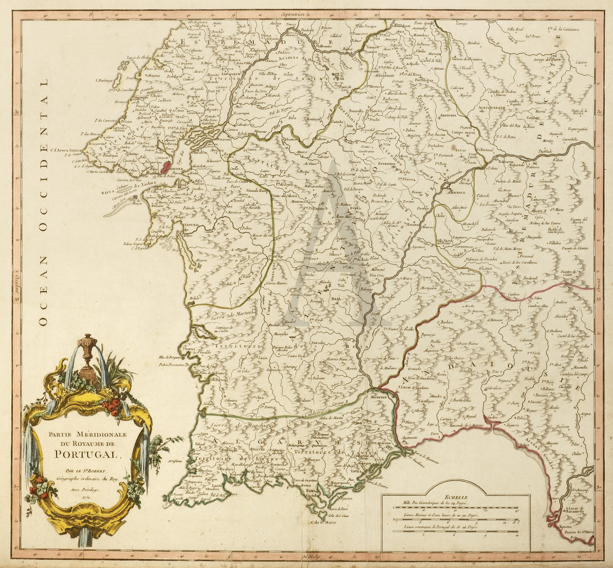 Fine map of Portugal with an elaborate cartouche at lower left. Vaugondy issued one of the first atlases based on scientific surveys, in the tradition of D’Anville and De L’Isle. He was one of the leading exponents of the French School of Theoretical Cartography like Nicholas Bellin which popularised the notion of an imaginary east coast of Australia. Highly respected Royal cartographer.