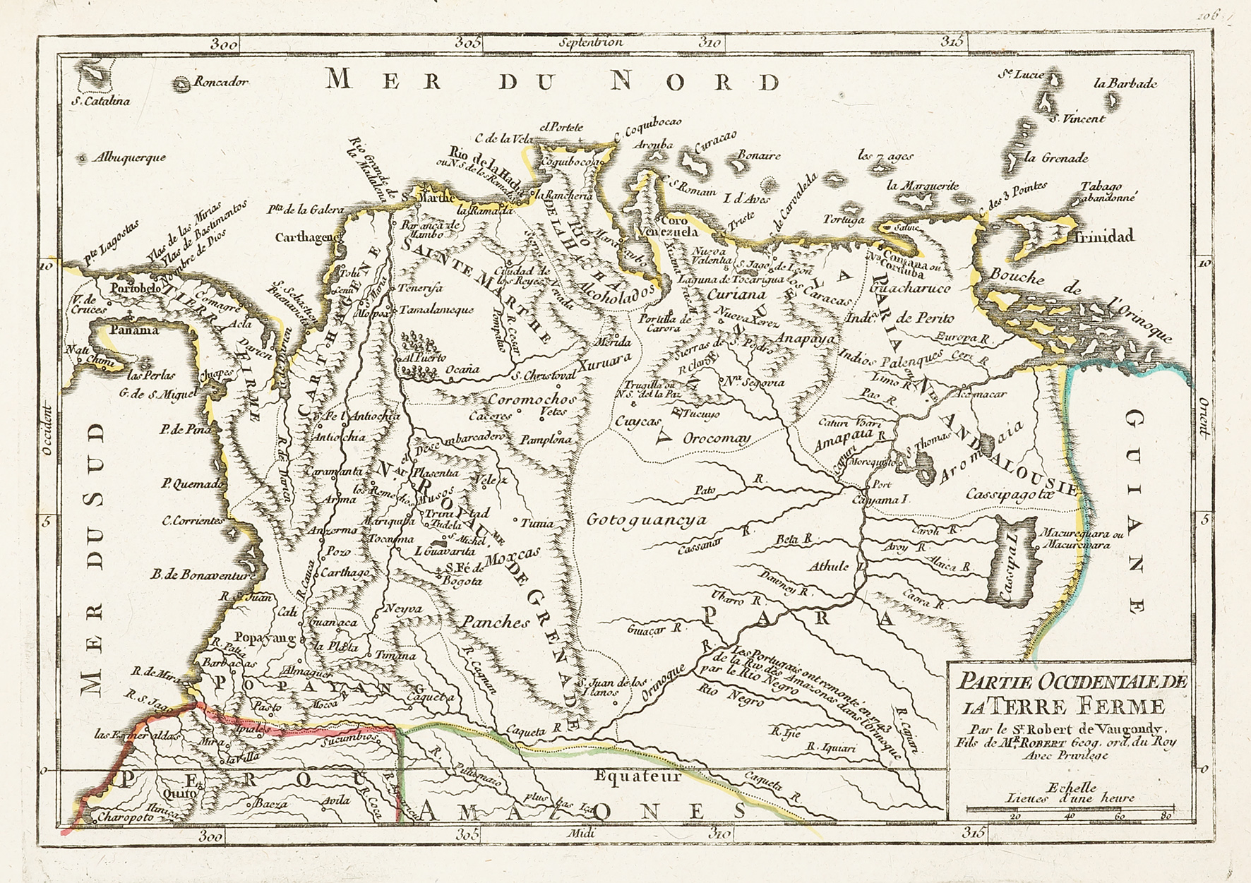 Scarce c.18th French hand coloured engraved map of Colombia, Panama and Venezula by Robert de Vaugondy (1688-1766).
