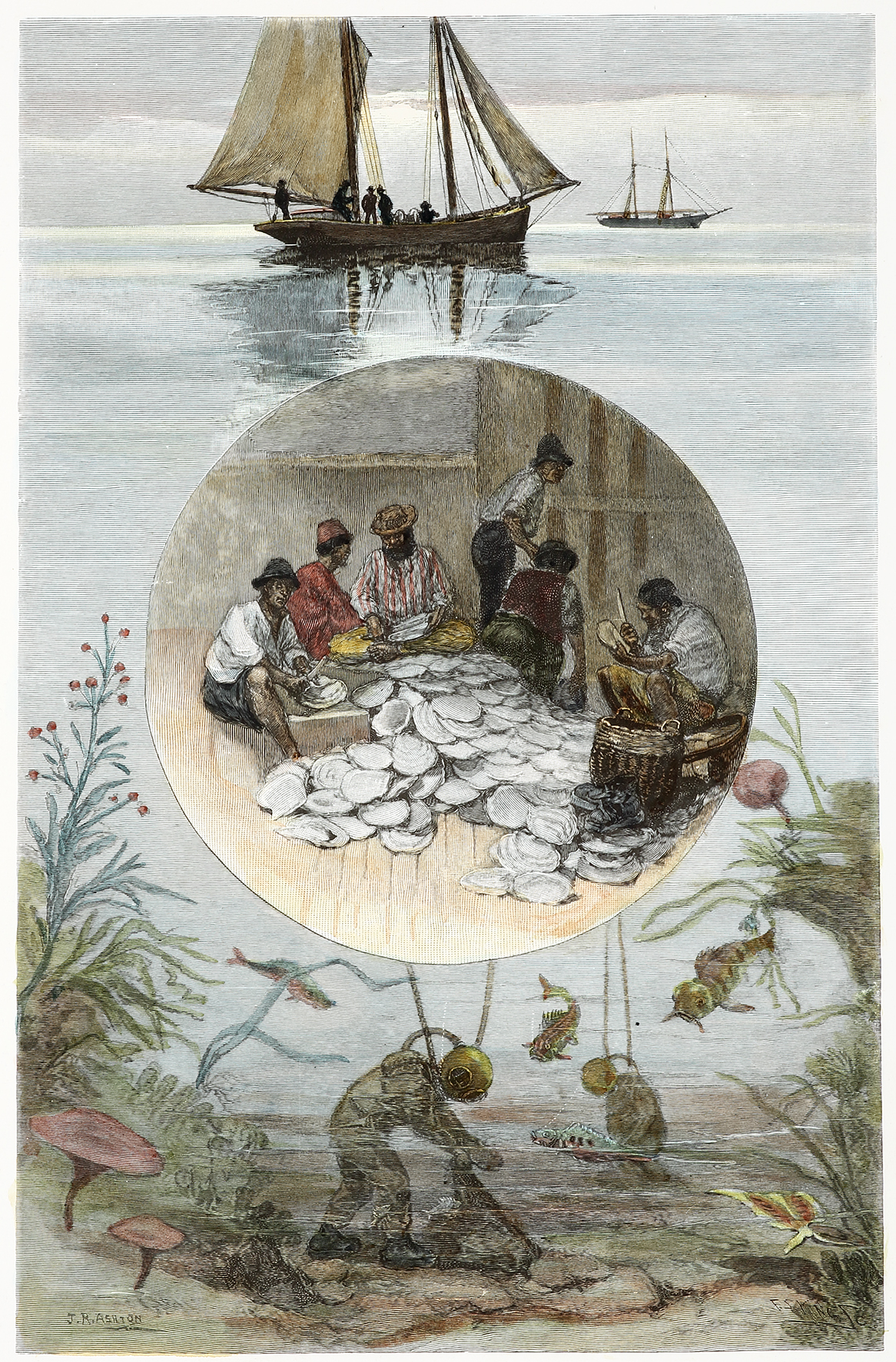 Colonial image of pearl luggers with helmeted divers below and an inset of the oysters being opened.
