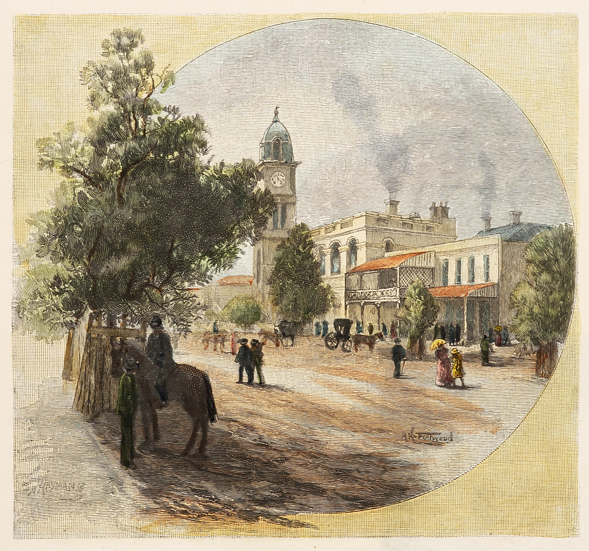 Scarce c.19th engraved view of Peel Street, Tamworth, New South Wales, looking towards the town hall.