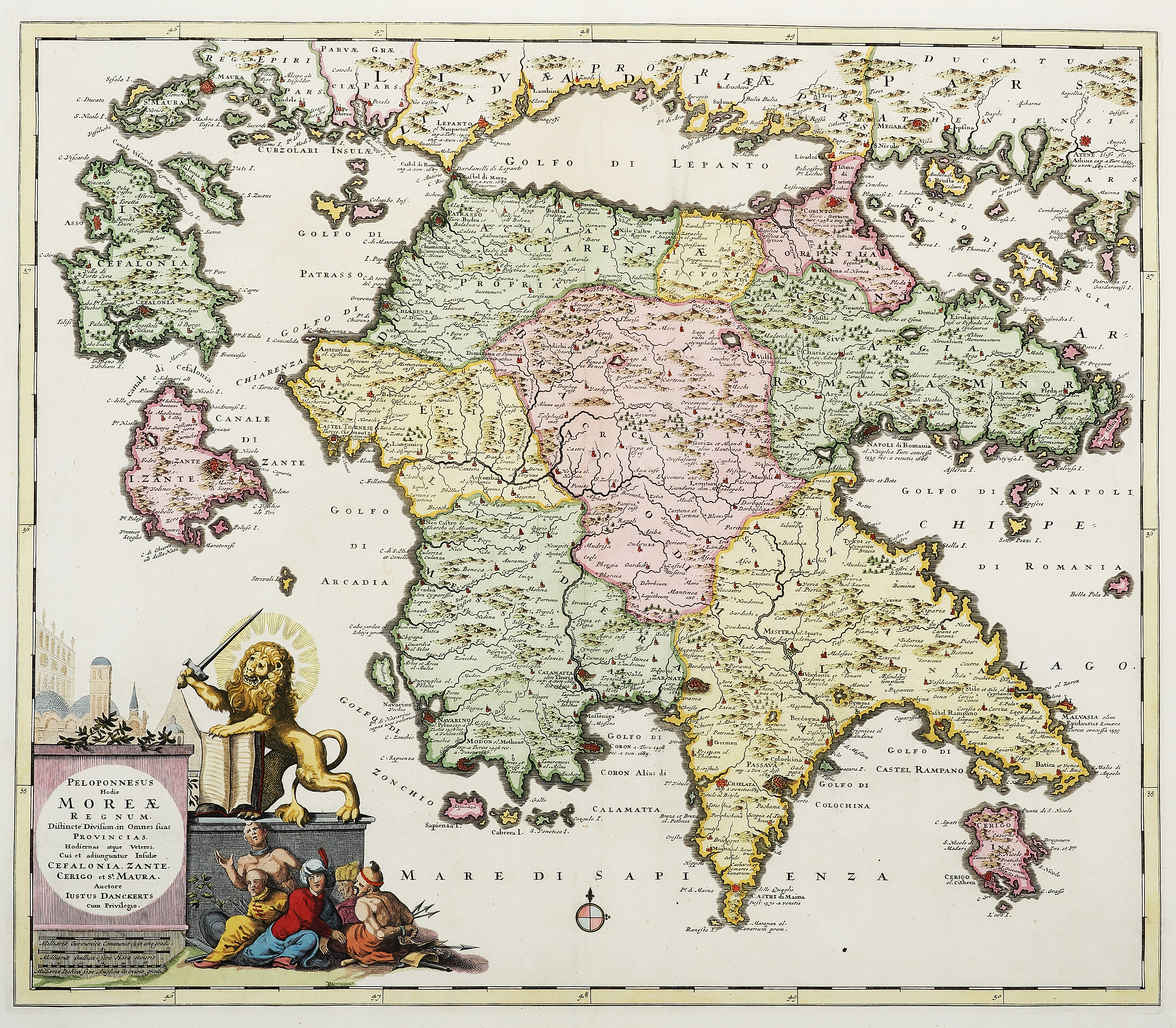 Scarce, large scale c.18th map of the Peloponnese by Justus Dackerts (1635-1701), with a superb decorative title cartouche at lower left depicting the Lion of Venice defeating the Ottoman forces on behalf of Christianity.