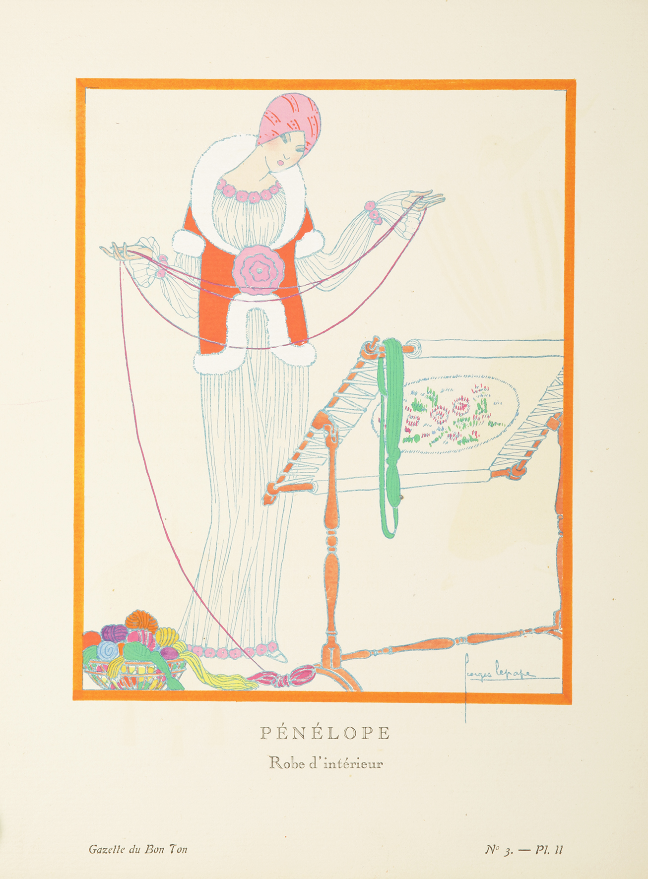 Lepape was born in Paris, France in 1887 and studied at the École des Beaux-Arts. In 1910 he exhibited at the Salon d’Automne, where he met the great designer Paul Poiret. They became friends and began collaborating together. In 1911, he illustrated Poiret’s brochure, Les Choses de Paul Poiret.