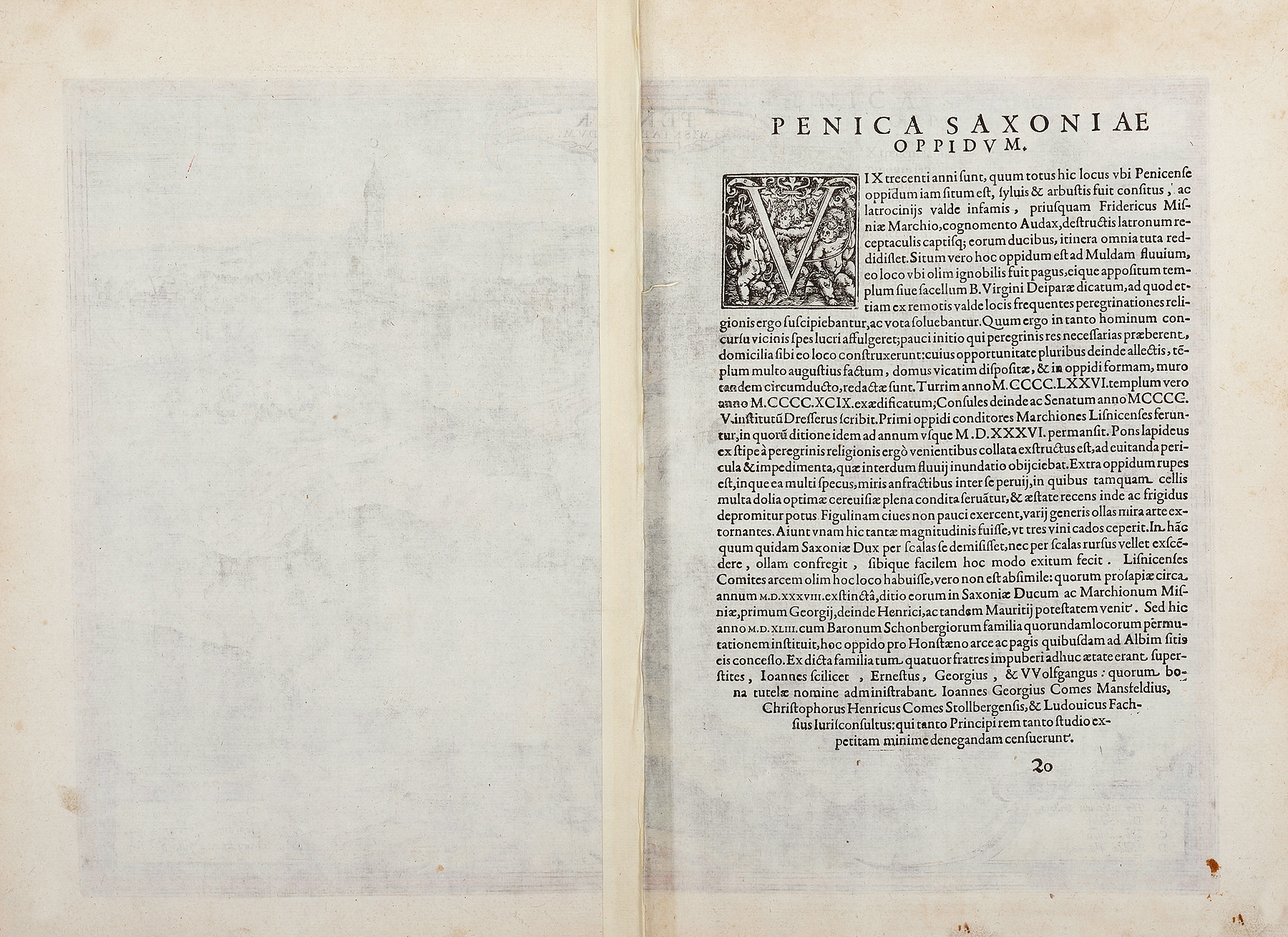 The view is taken from a hill to the west of the town, which lies in a meander of the navigable Zwickauer Mulde (D). It is dominated by the late Gothic parish church of Our Lady on the Mountain (C), which was consecrated in 1515. In pre-Reformation times, from about the 12th century on, this was one of the famous places of Marian Pilgrimage in Saxony. On the left, on the other bank of the Mulde, is Old Penig with the Romanesque church of St Giles. The town wall was built from the middle of the 15th century. The 16th-century Renaissance New Castle (B), seat of the Counts of Leisnitz and Schönberg, towers above the houses of the burghers and artisans. Penig is situated on the former Prague-Chemnitz-Magdeburg trade route, and was recorded for the first time in 1301.