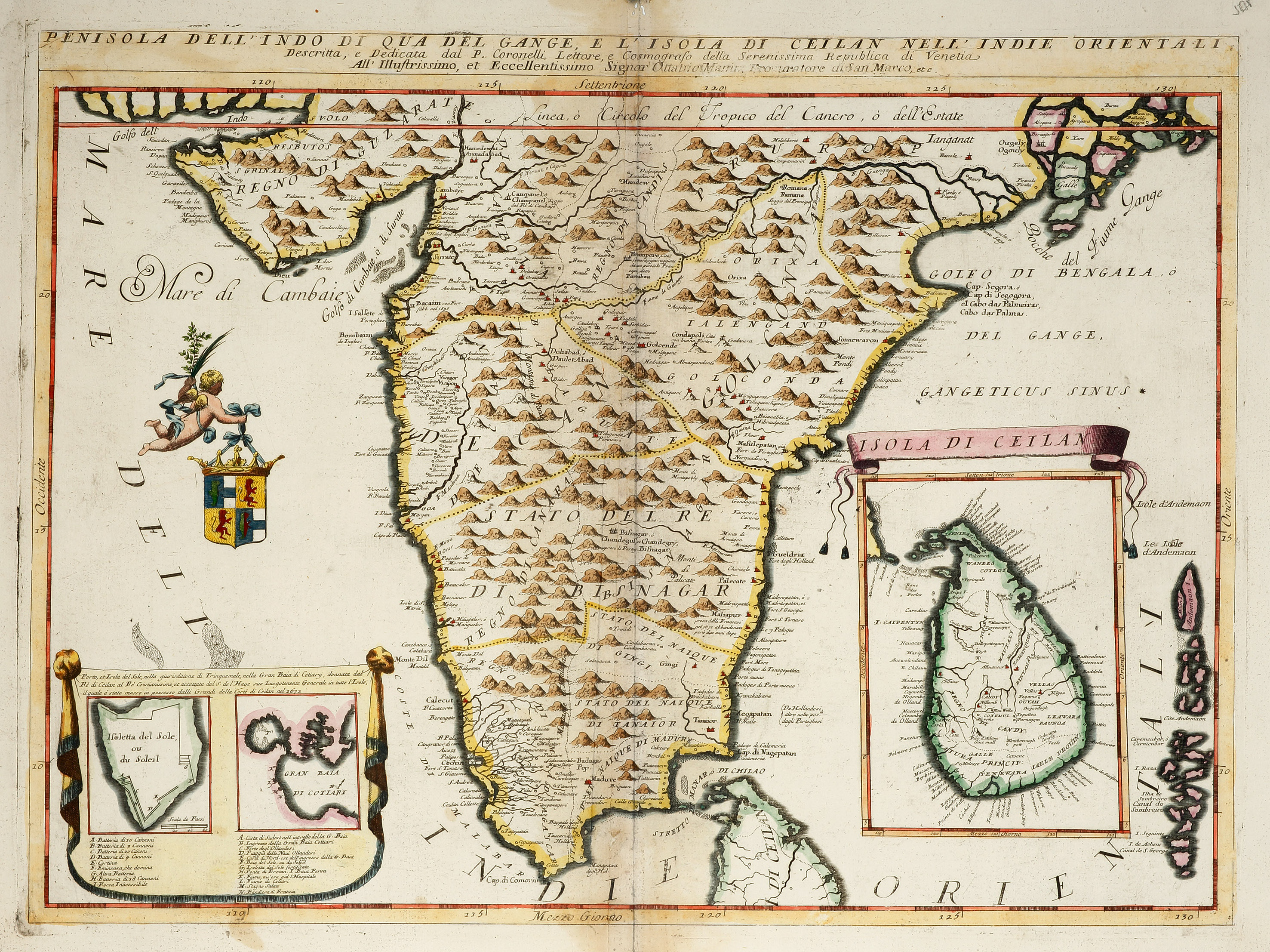 Impressive c.18th map of of India and Ceylon by Vincenzo Coronelli with insets at lower right, titled; Isola de Ceilan and another at lower left; untitled [Isola del Sole] [Gran Baia di Cotiary]. There is a very decorative cherub holding the coat of arms of Signor Ottavio Manin, the last Doge of Venice, (Ludovico Giovanni Manin) who was forced to abdicate by Napoleon on 12 May 1797.