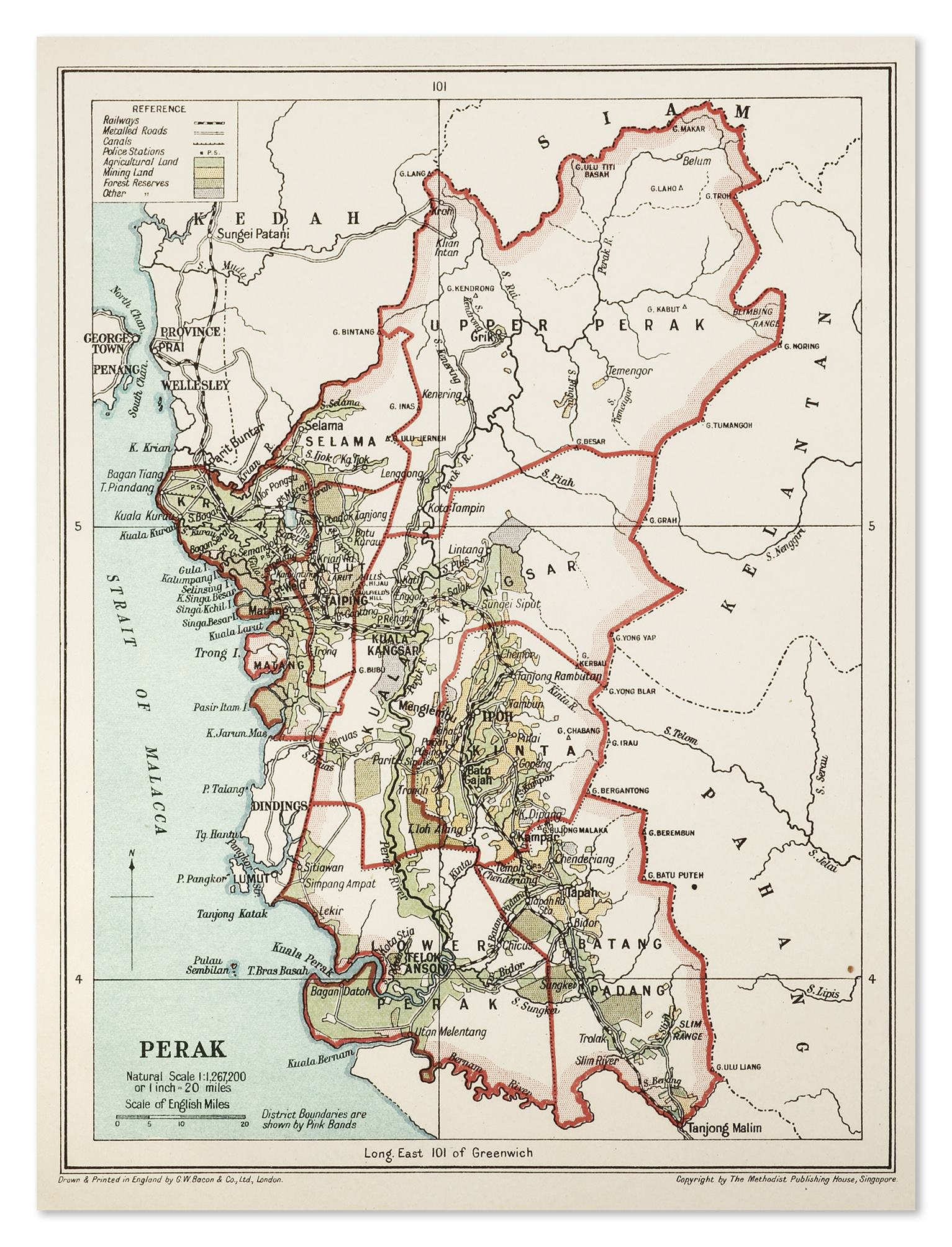 Rare map showing state boundaries of Perak towns, place names, kampongs, districts, Mukims, estates, forest reserves, roads with mile stones, railways, rivers and trigonometrical stations.