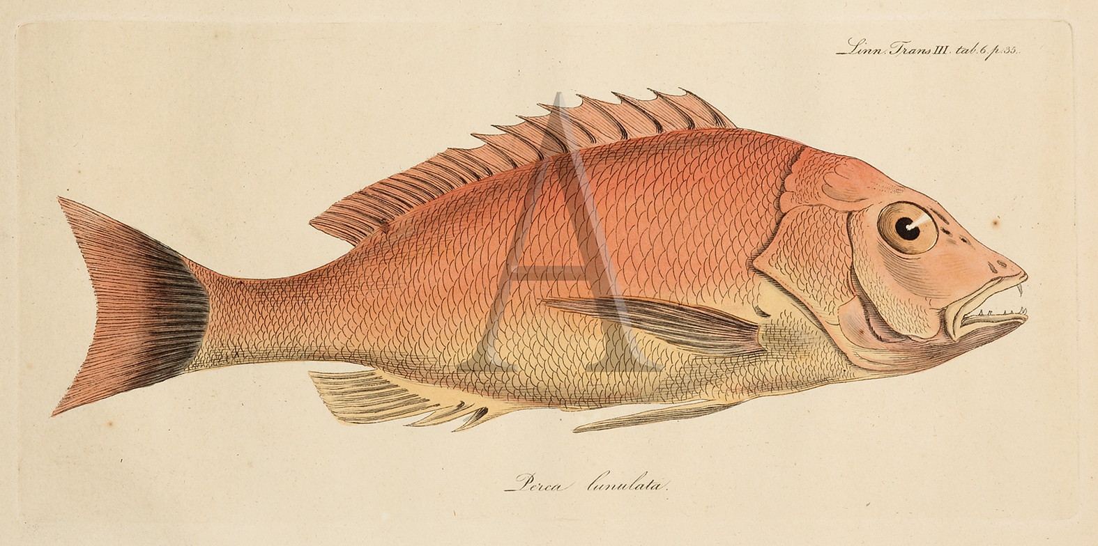Rare engraving of the Crescent snapper, collected by Mungo Park (11 September 1771 – 1806) in Sumatra. Park was a Scottish explorer of the African continent. He was the first Westerner known to have travelled to the central portion of the Niger River. Before his African expeditions, Park left on February 1793 on the Worcester and sailed to Benkulen in Sumatra. Before departing, Park wrote his friend Alexander Anderson in terms that reflect his Calvinist upbringing: My hope is Transactions of the Linnean Society, v. 3, published in 1797.