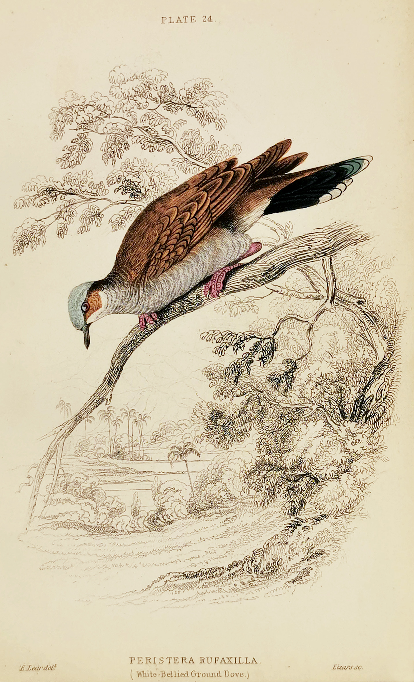 Lear was was an English artist, illustrator, musician, author and poet. By the age of 16 was already drawing "for bread and cheese" and soon developed into a serious "ornithological draughtsman" employed by the Zoological Society and then from 1832 to 1836 by the Earl of Derby, who kept a private menagerie at his estate, Knowsley Hall. He was the first major bird artist to draw birds from real live birds, instead of skins. Lear's first publication, published when he was 19 years old, was Illustrations of the Family of Psittacidae, or Parrots in 1830. One of the greatest ornithological artists of his era, he taught Elizabeth Gould whilst also contributing to John Gould's works and was compared favourably to the naturalist John James Audubon. His eyesight deteriorated too much, to work with such precision on the fine drawings and etchings.