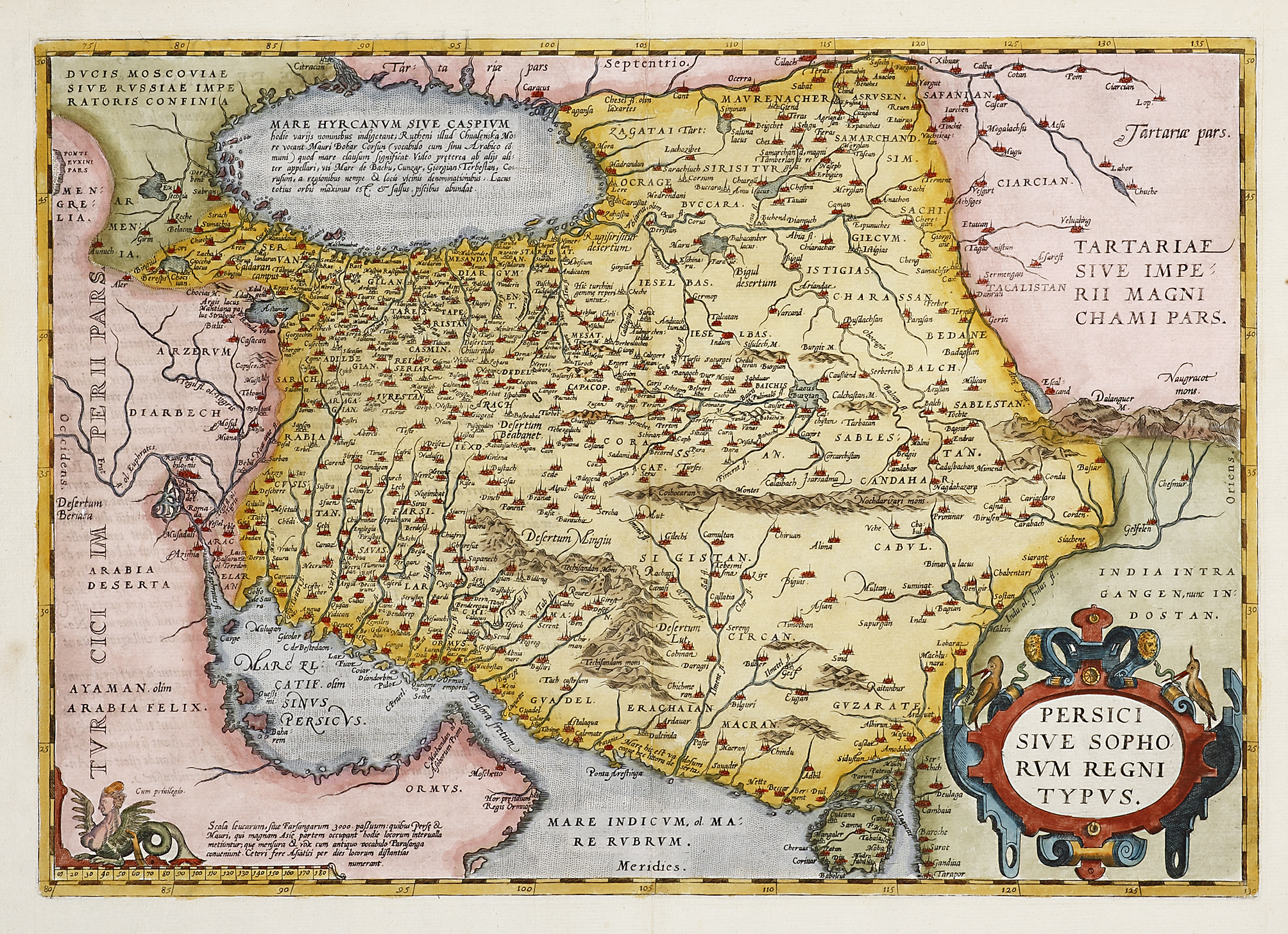 Scarce French issue of Ortelius’s map of Persia, which was based on Gastaldi’s 1564 map of Asia Minor and Ortelius’s own map of Asia. It includes present day Iraq and Afghanistan.