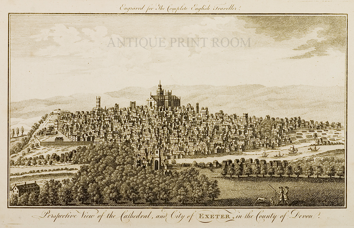 Perspective View of the Catherdral, and City of Exeter, in the County of Devon - Antique Print from 1747