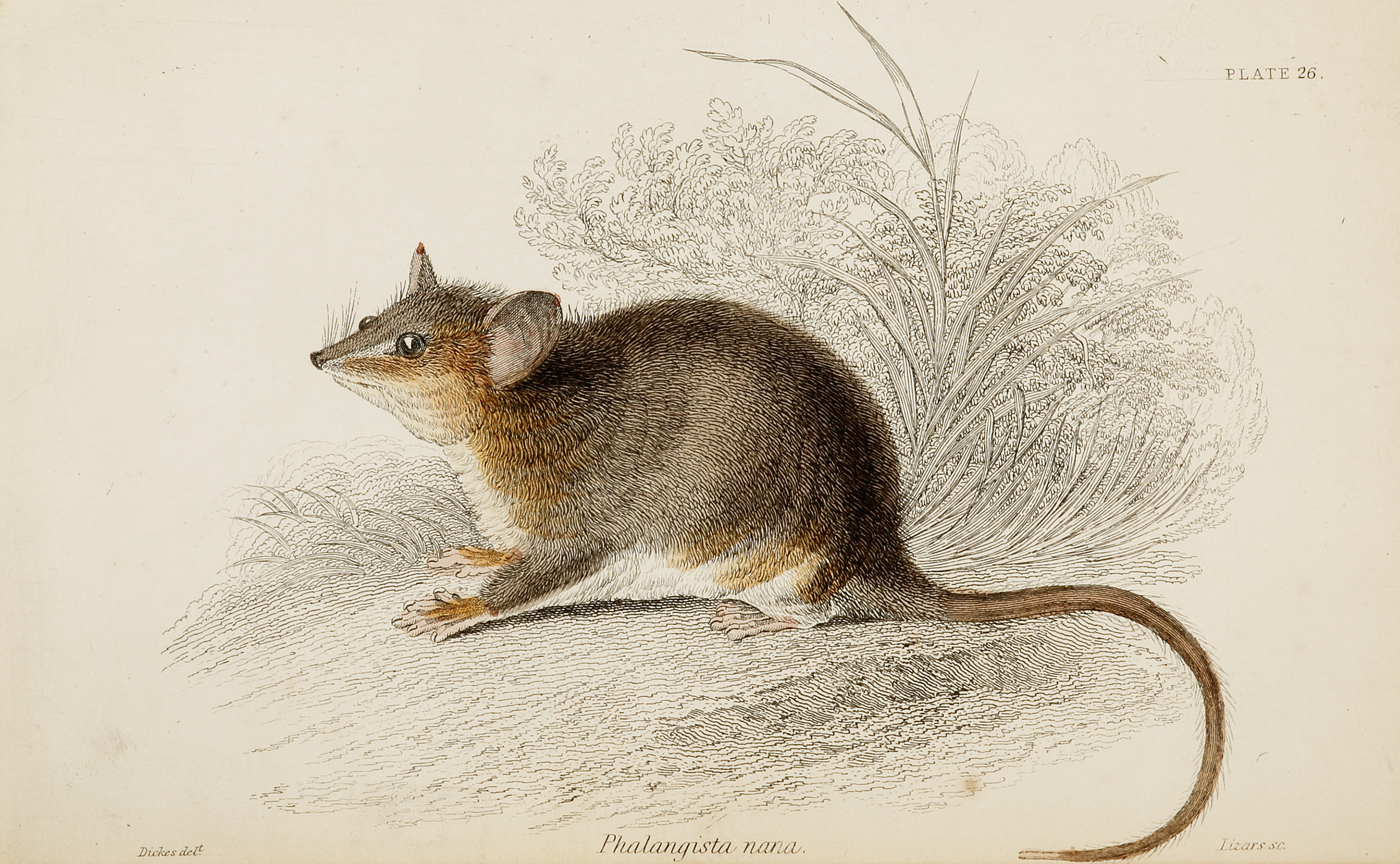 C19th engraving of the Eastern Pygmy Possum, from The Naturalist’s Library. This series of engravings of Australian mammals, predates Gould’s epic work done in 1863. This is the first issue with fine original hand colouring.