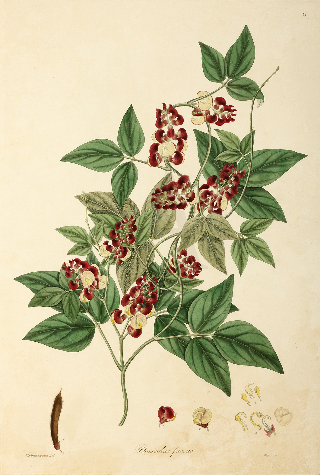 Very rare large botanical from Nathaniel Wallich’s, Plantae Asiaticae Rariores. Modern binomial name: Phaseolus fuscus Wallich’s series, Plantae Asiaticae Rariores was issued in 1830–1832. Wallich used for the first time Indian artists for the original paintings. These talented artists were, Vishnupersaud and Gorachand. Vishnupersaud’s … Read Full Description
